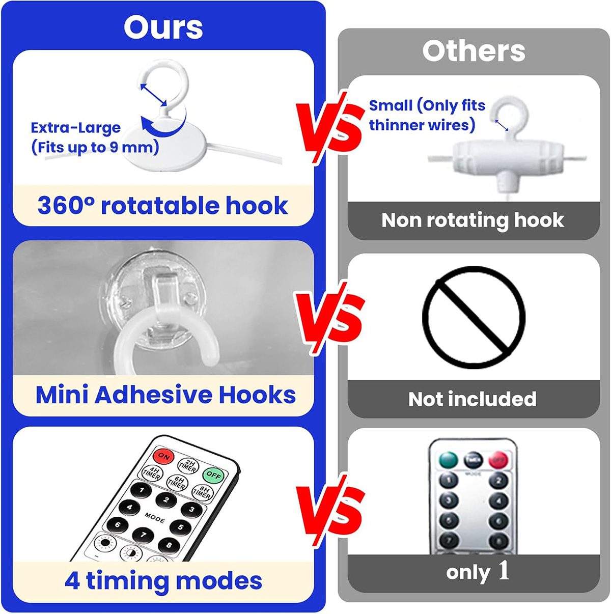 - 【8 Light Settings & Timer Remote】: Unlike others, our 17-Keys remote added 4 timing modes (2/4/6/8 hours on, 22/20/18/16 hours off). 8 different flash modes to choose from, and you can adjust the brightness of the lights by pressing "dim" ,“+” and "-". That are all controlled easily by a wireless remote at 10~15 meters, aim at the USB receiving direction when you press. All is in your control.