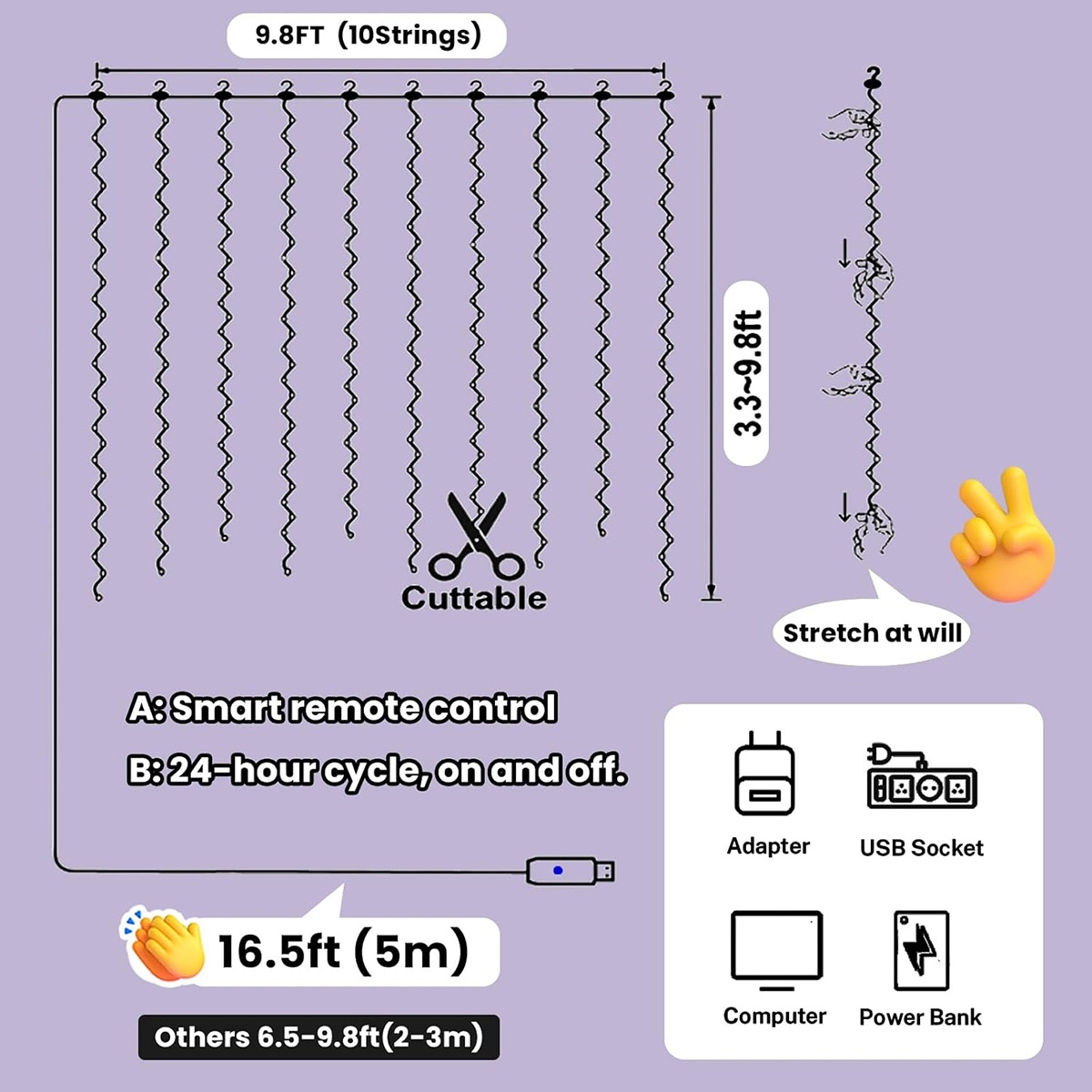 - 16.5 Ft Lead Wire: 300 individual LEDs, 9.8ft.x9.8ft curtains lights come with extra 16.5ft long power cord; 9.8ft main strand and 10 drop strings included hooks; Copper wire drop strings is tough and flexible, hanging and adjustable desired height naturally easily; No limits to your imagination, Do the shape you like; Enjoy a fairytale world (Curtain is NOT included)