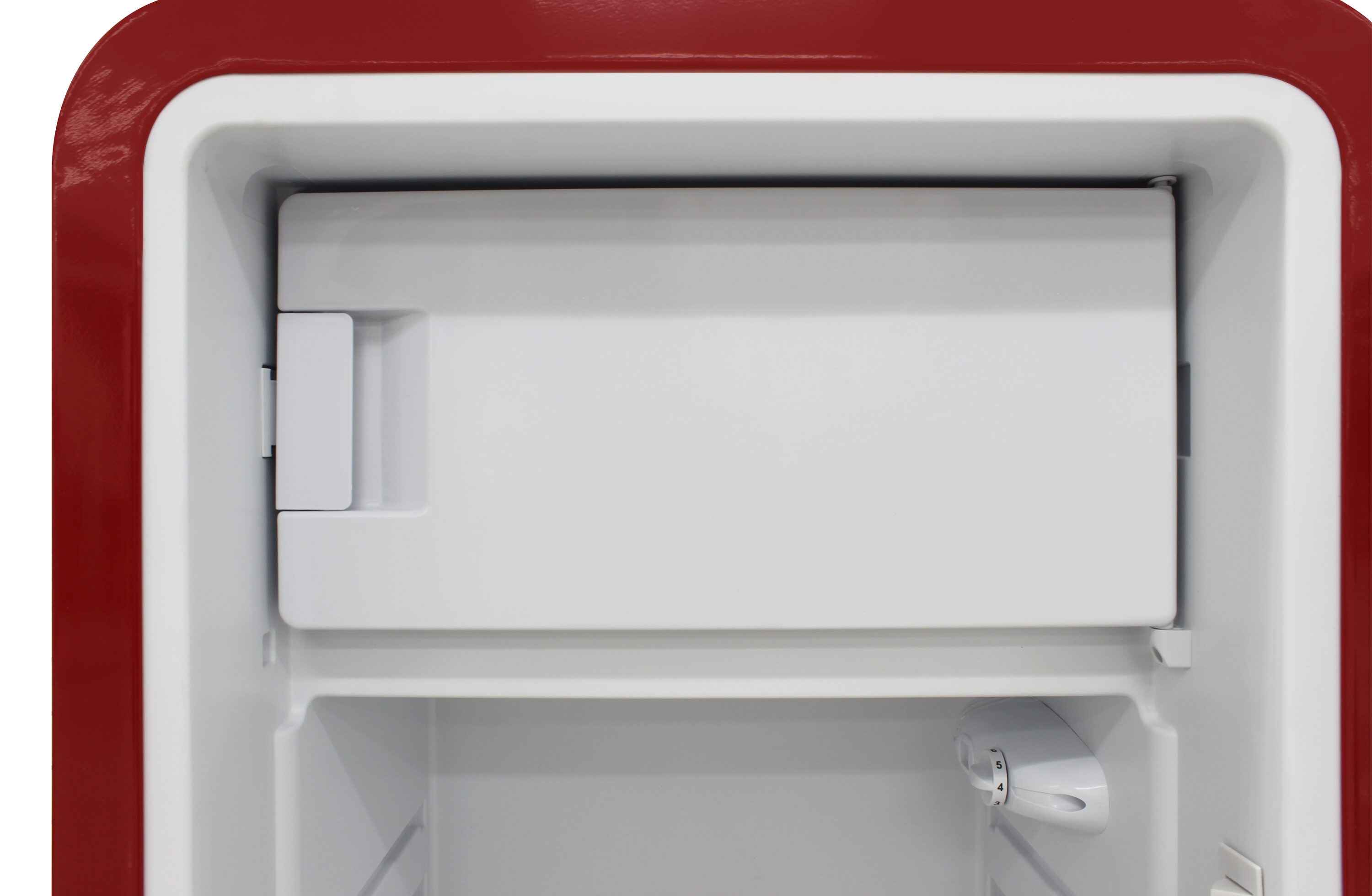 Keep all of your goods at the perfect serving temperature with the Brama Retro Refrigerator. This unit features a top freezer, interior light, open storage with 4 pull-out shelves including one metal wire racking, bottom bulk storage, and 4 rows of small storage behind the door. The red, rounded exterior with solid steel door gives a retro and modern look and makes a perfect addition to to any space.