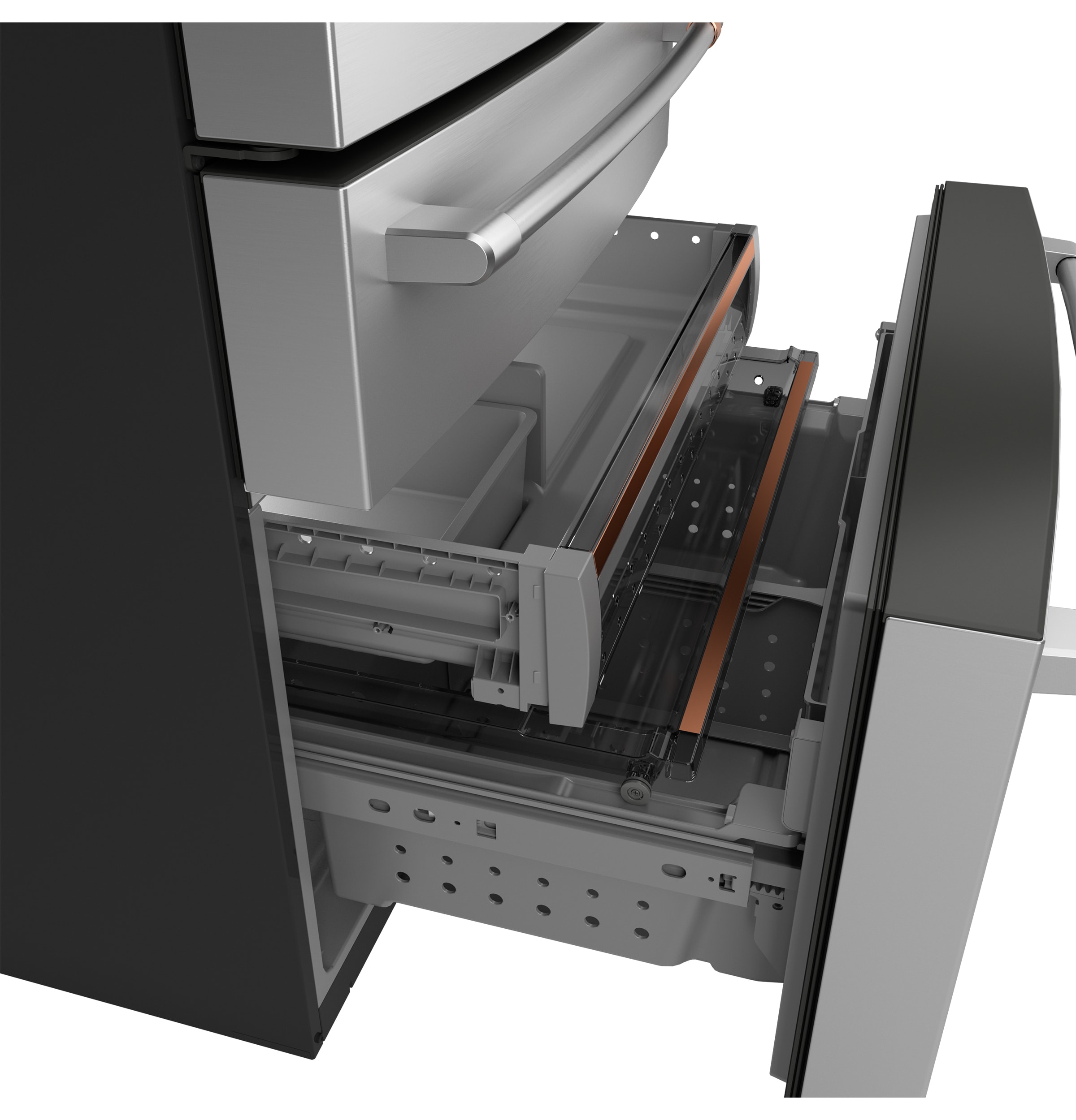 Flatbread Freezer Compartment – a slim, full width freezer compartment designed to hold flatbread, pizzas, and other uniquely shaped frozen items is one of the many sliding shelves and trays in this three-level storage system