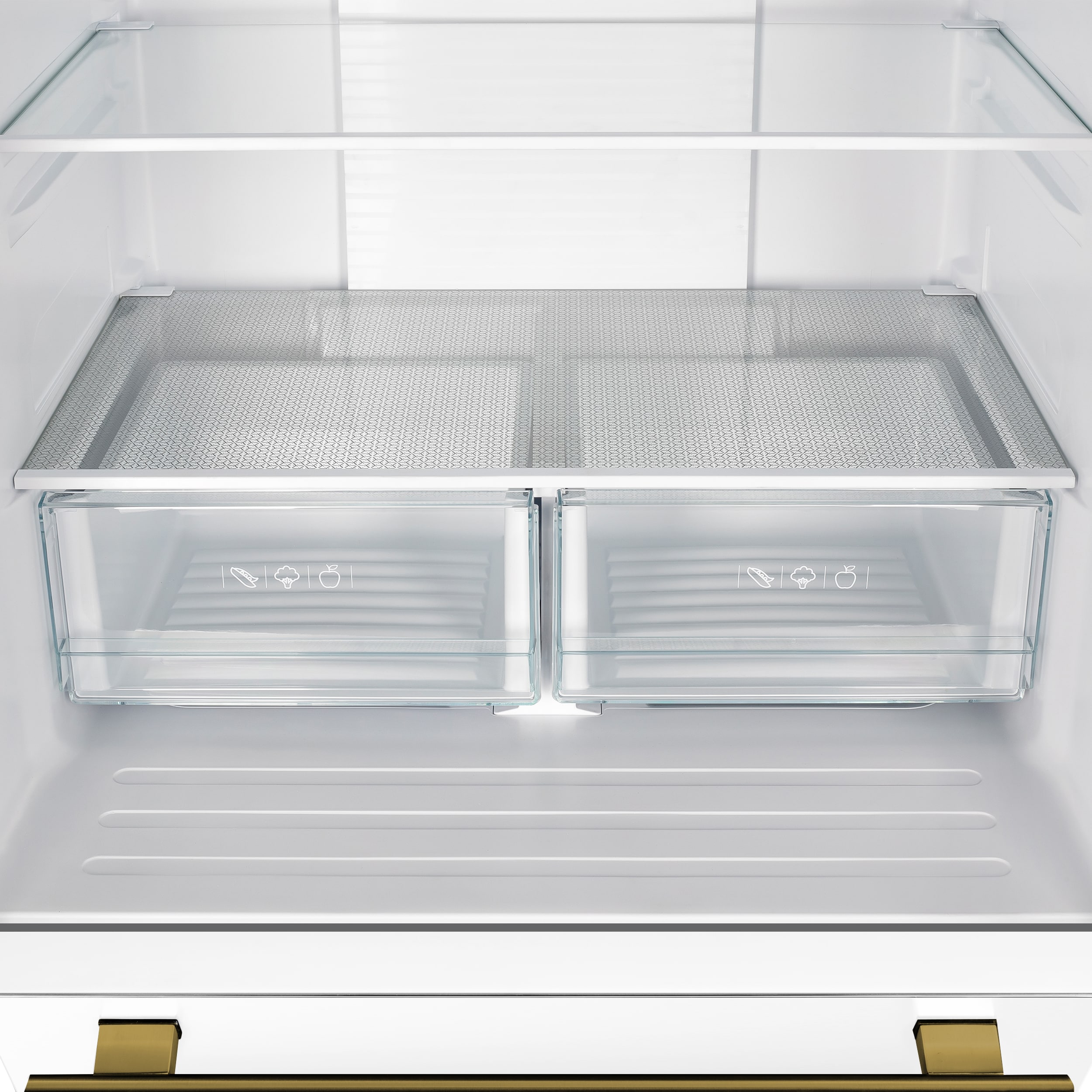 The Forno Espresso Gallipoli 31 Inch White French Door refrigerator combines style and functionality with its frost-free multi-air flow cooling system, offering a spacious 17.5 cu.ft. capacity. Adjustable shelving ensures versatile grocery storage, complemented by a compressor inverter for energy efficiency, quiet operation, and precise temperature control. The LED touch panel provides convenient access and control. The fresh food storage (12.4 cu.ft.) features three glass shelves (two adjustable), two crisper drawers, and ample door storage. The 5.1 cu.ft. freezer boasts organized storage with one pull-out drawer that contains 2 drawer, a removable ice bucket and a high-capacity automatic ice maker producing up to 4 pounds of ice daily. This refrigerator is ENERGY STAR Certified for efficiency, and high-efficiency LED lighting minimizes food spoilage. Antique brass handles add an elegant finishing touch to this high-performing and stylish appliance.