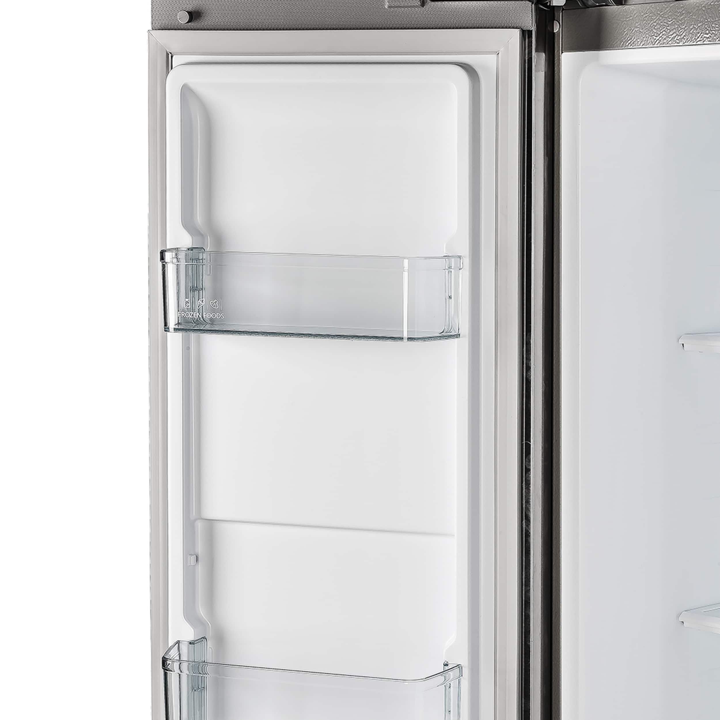 9.54 cu ft of fresh food storage is equipped with 3 adjustable glass shelves, 2 crisper drawers, 2 door basket bins and 1 door gallon bin