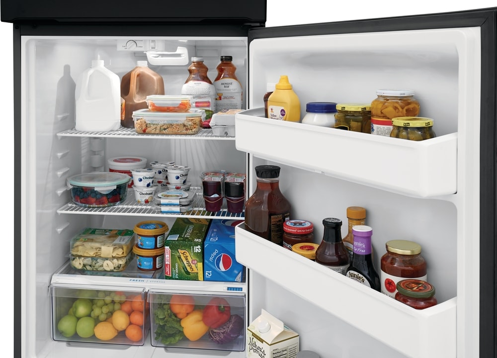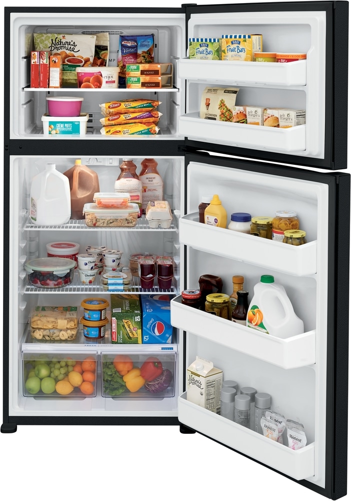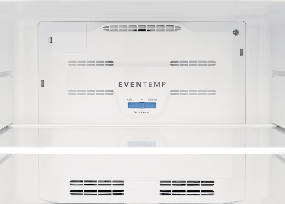 This Frigidaire 18 cu ft top freezer refrigerator offers a timeless style with the latest cooling technology. Our EvenTemp™ Cooling System prevents unwanted freezing by optimizing airflow and ensures a consistent temperature throughout your refrigerator. The spacious interior storage enables you to easily organize your family’s favorites with two wire shelves, spacious door bins, and a full-width glass freezer shelf.