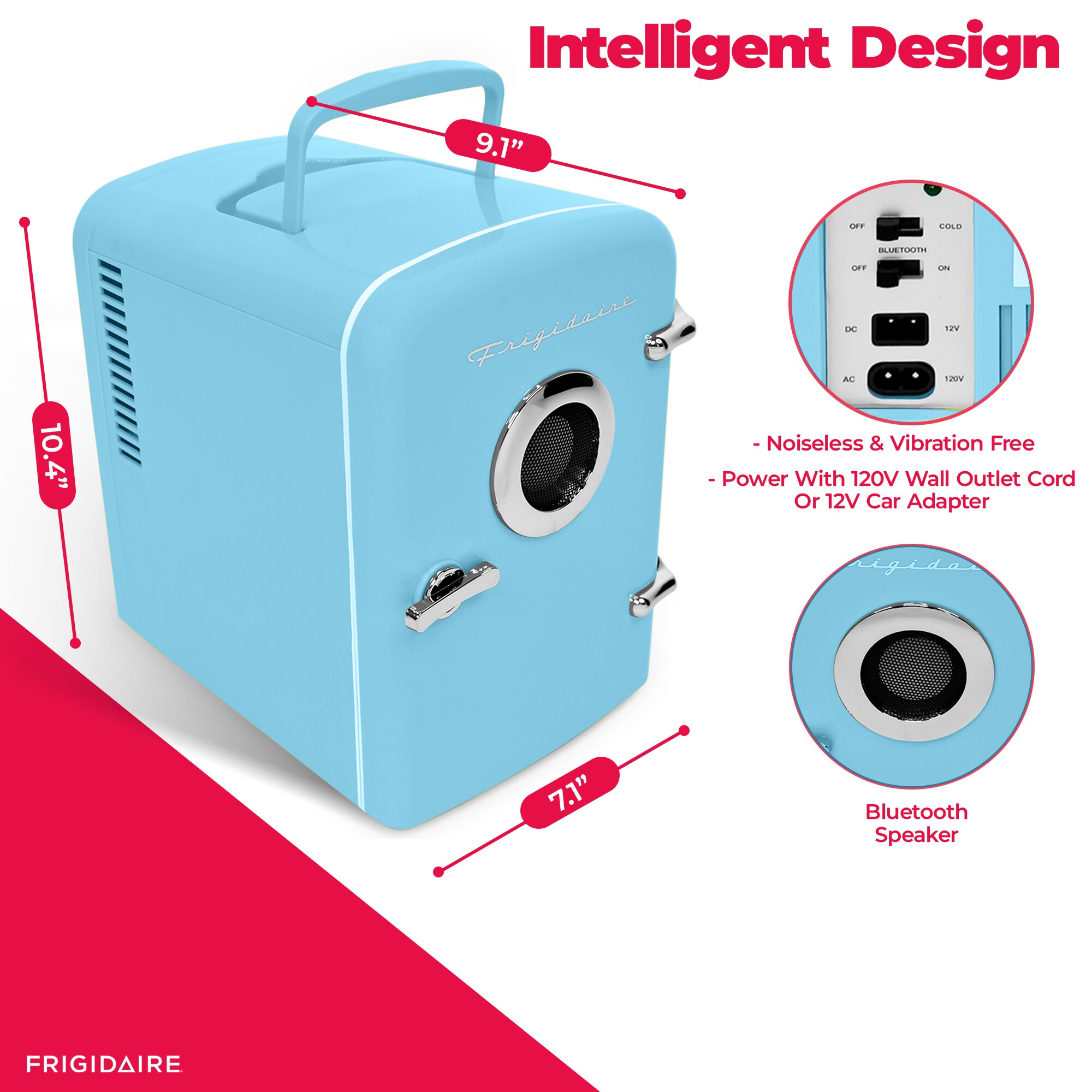 The 6 Can mini fridge with built-in Bluetooth speaker is perfect for entertaining on the go, in the office or in your dorm, the integrated speaker connects to your compatible smart devices so you can stream music or podcasts while enjoying your favorite hot or cold beverage