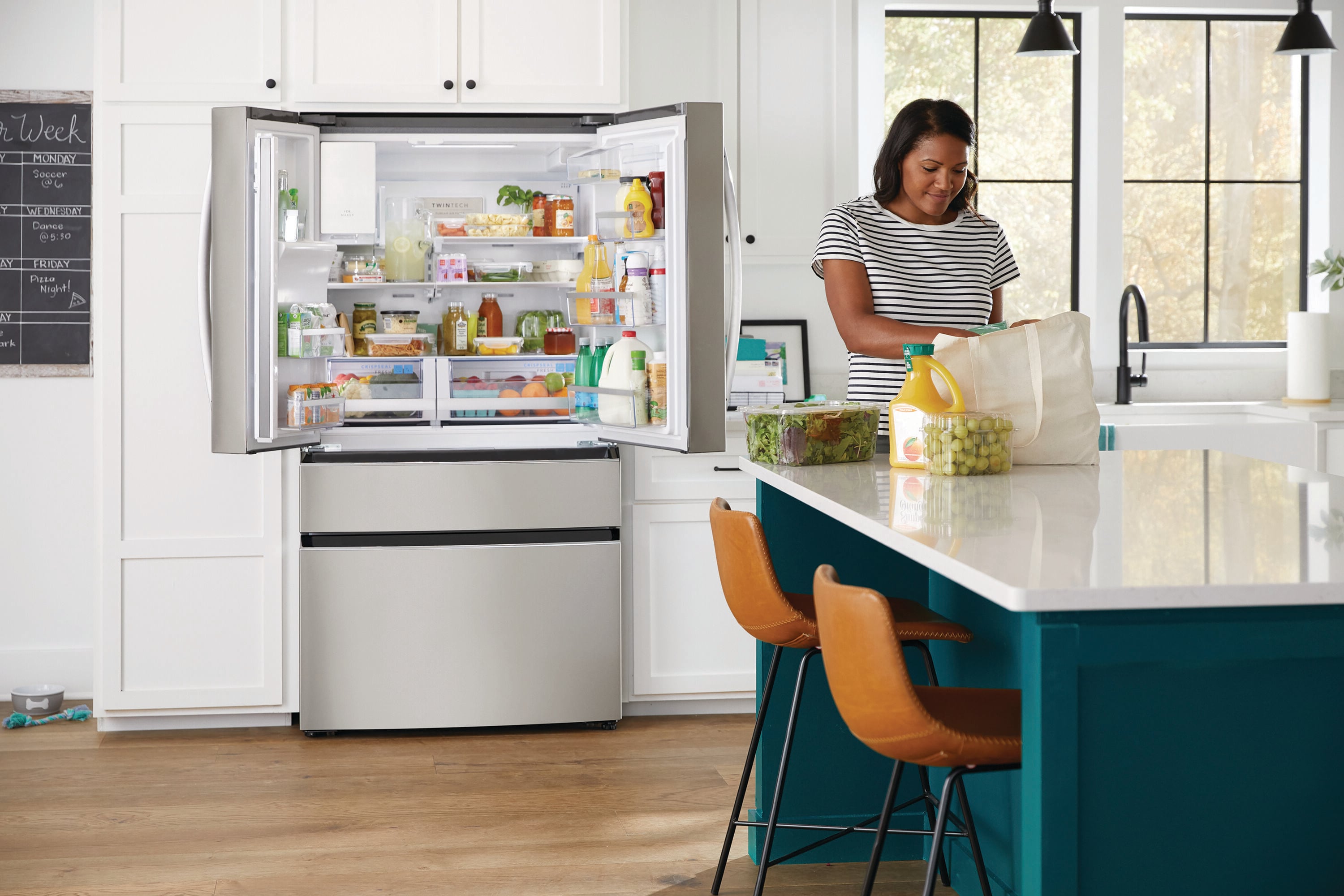 This Frigidaire Gallery French door refrigerator maintains the taste and texture of even your most delicate foods. Lettuce and broccoli stay fresh and crisp for longer in our exclusive CrispSeal® fresh crispers than in any comparable crispers. Our 3 advanced technologies block out dry air, automatically optimize humidity while removing excess moisture, and our built-in antioxidant filter reduces ethylene gas, odors and preserves produce color. Get more storage out of your refrigerator with clever organization solutions that maximize usable space, including in-door condiment storage, a slide-under shelf, a snack zone, a flexible bin which can be used as crisper or an open compartment, and accessory railing system which works with our optional storage pan and wine rack. Get extra space for all your most used items with the custom-flex temp drawer. Store yogurt, beer, or even frozen pizzas with the middle drawer that can be a refrigerator or a freezer. Awarded Editor’s Choice French Door Refrigerator of 2023 by Reviewed.com (USA Today).