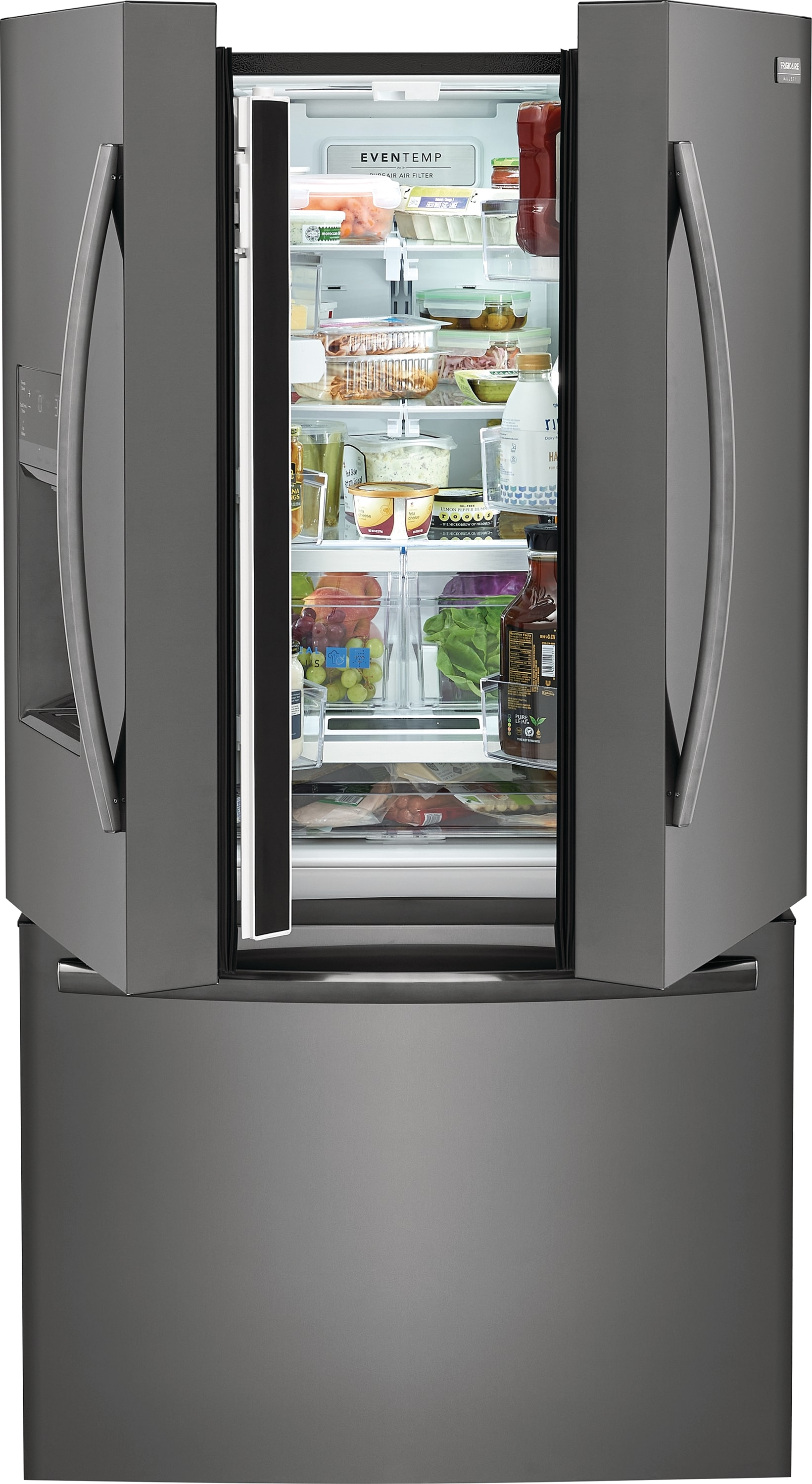 This Frigidaire Gallery French door refrigerator offers a freshness system that maintains the taste and texture of even your most delicate foods. Help prevent produce from spoiling: advanced CrispSeal® Plus Crispers with auto humidity technology automatically removes excess moisture plus an added ethylene filter reduces the gas emitted by many fruits and vegetables that causes spoiling. Get more storage out of your refrigerator with clever organization solutions that maximize usable space, including in-door condiment storage, slide under shelf and accessory railing system. Keep your food fresh in our adjustable temperature drawer, with three temperature setting perfect for everything from yogurt and party platters to meat and chilled drinks.