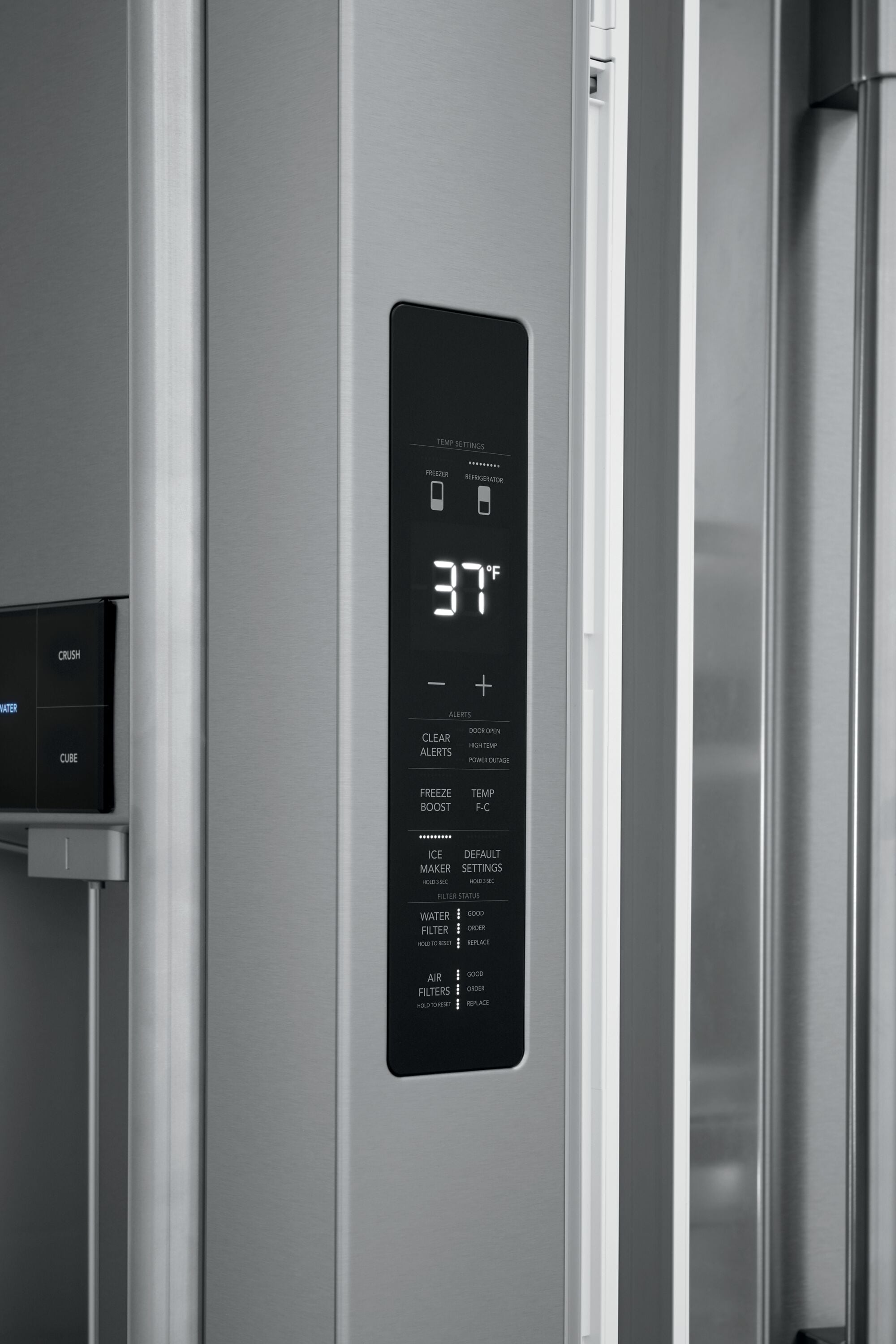 This Frigidaire four-door French door refrigerator offers the Custom-Flex® Temp Drawer, the only drawer available that fully switches from frig to freezer, so you can store all your family favorites from yogurt to frozen pizza. It helps keep fruits and vegetables fresh longer with CrispSeal® crispers, and it’s easy to organize and clean with SpaceWise® organization system and Smudge-Proof® stainless steel.