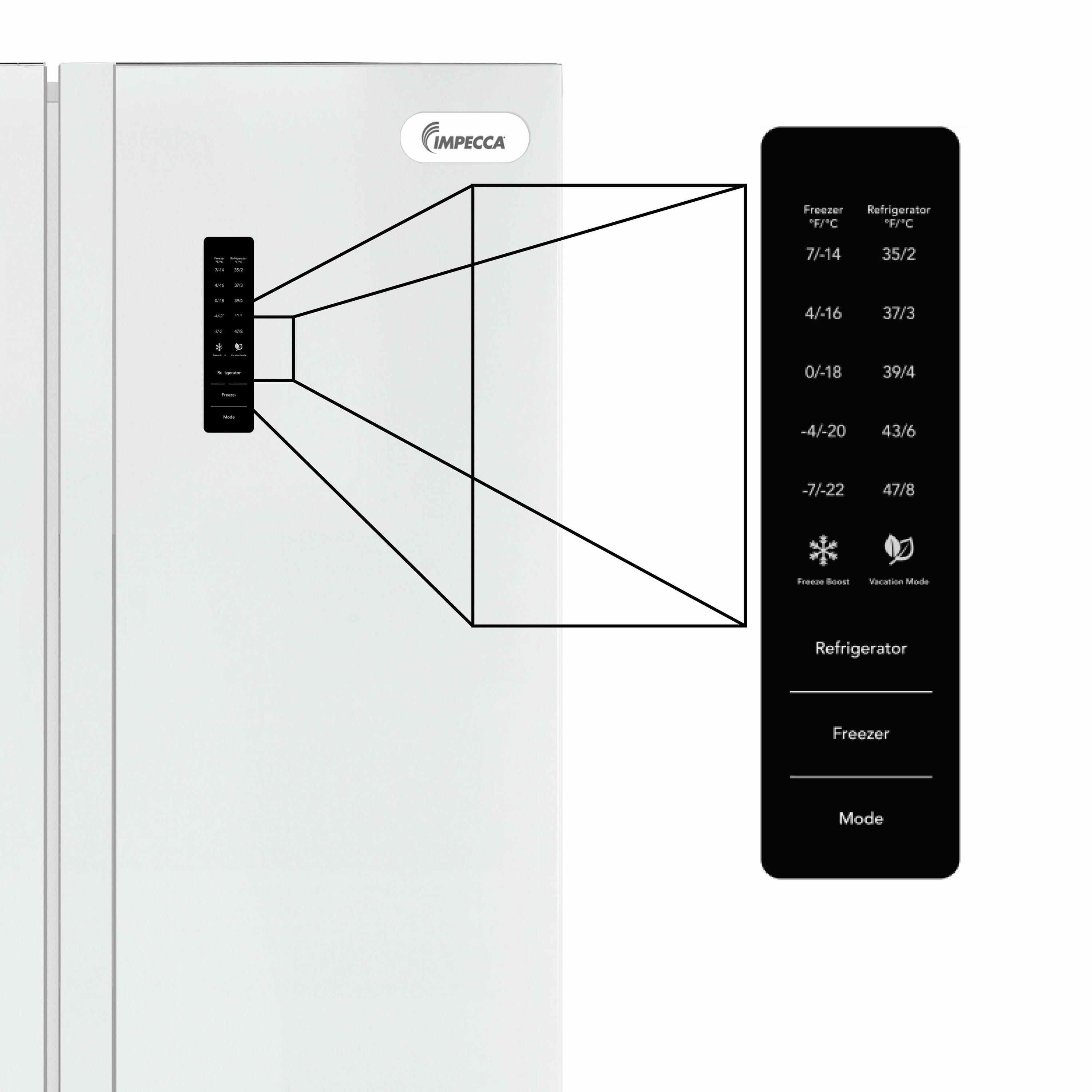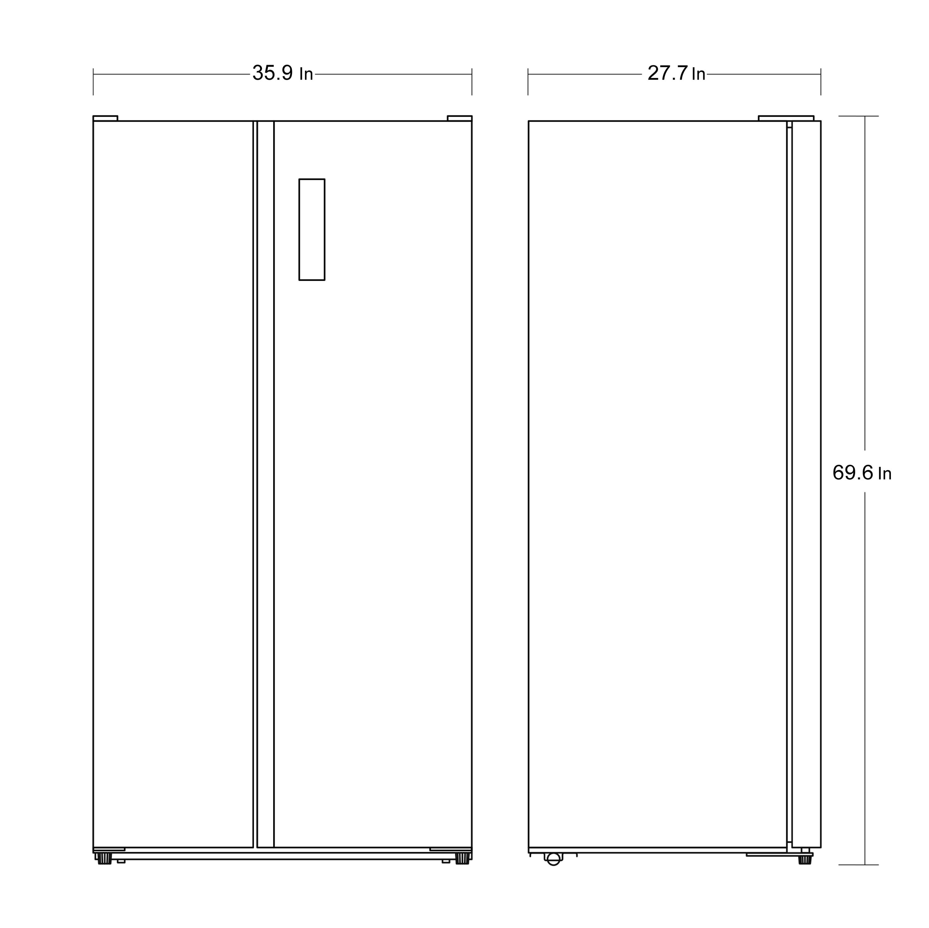 Fresh Food in the right Door and Freezer in the left door, measuring WDH 35.8 x 26.4 x 66.7 inches