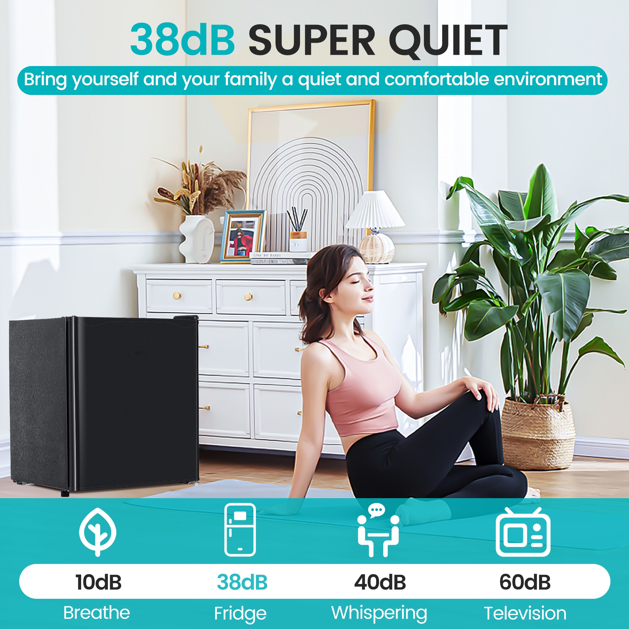1.6 Cu.Ft. Small Refrigerator is perfect for keeping your favorite beverage cool, fruit or other food fresh, and suitable for bedroom, dorm, office, bar, and outdoors. This small refridgerator has minimum temperature can reach 24.8 degree, and the maximum temperature can be controlled to 50degree, is also a freezer box in the refrigerator, which can store items that need to be kept below the freezing point can also be used to make ice. The 5-level thermostatic control system allows you to adjust the temperature you want freely. It has engery saving and low noise, and it will not affect our work and rest.