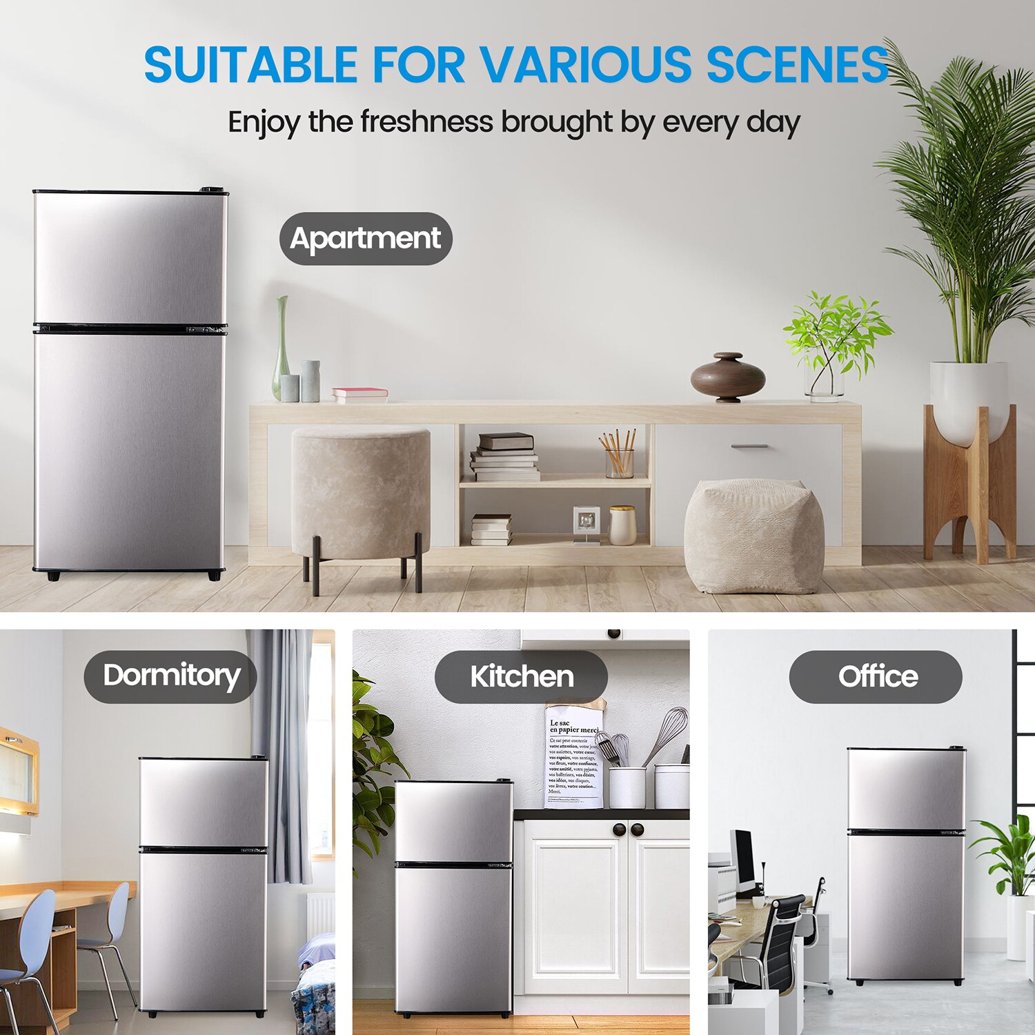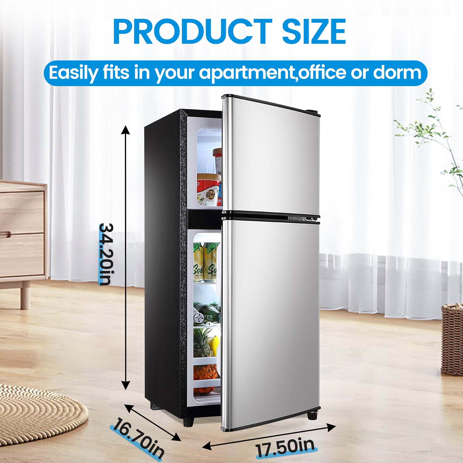 This 3.5 cu.ft mini fridge is ideal for use in bedrooms, offices, apartments and bars. Double circulation zone cooling and double circulation zone cooling can isolate the outside heat, effectively maintain the temperature in the box, and improve the effect of food preservation. When the ambient temperature is below 0 degree, turn on the switch to make the refrigerator work passively, so that the temperature of the freezer is kept in the state of low temperature freezing. Double door design can keep fresh ingredients, lock food moisture, fruits and vegetables, drinks, snacks, etc. Fast refrigeration to lock in the nutrients of the ingredients; Storage: Fish, seafood, meat, ice cream, etc.