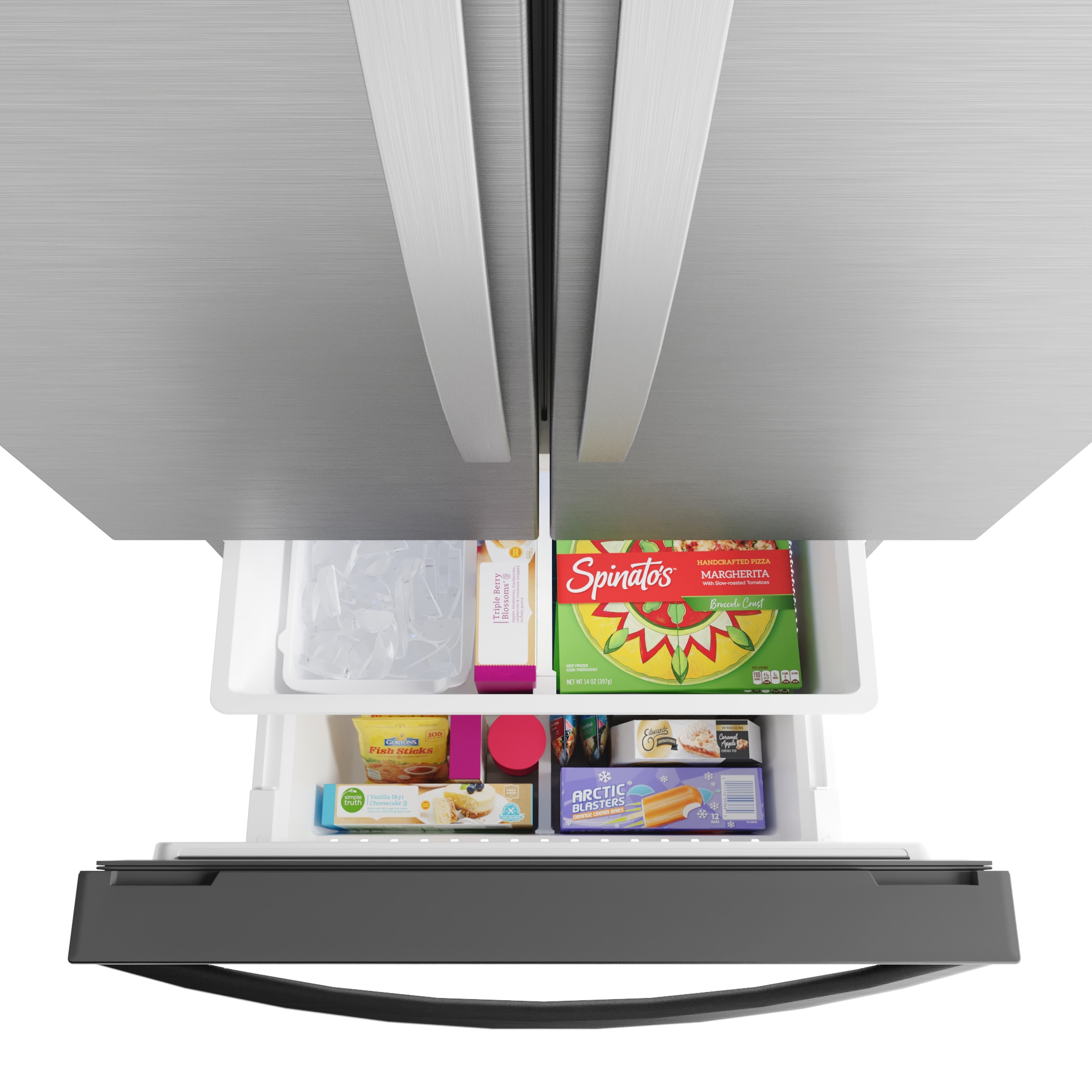 This fridge has 20.3 cu. ft. of storage space all with a compact footprint. Its counter-depth and gorgeous French door design makes it a great match for any kitchen. Fingerprint-resistant stainless steel keeps everything looking polished, and Accela Chill uses fan-forced cool air to accelerate cooling. Featuring adjustable full-width glass shelves, you can customize your fridge to fit taller bottles and make the most of your space. Humidity controlled crisper drawers are the perfect place to store fruits and veggies. Two, gallon-sized clear bins and the two-tier freezer organization provides easy and efficient storage. Full-width pantry drawer allows you to store deli trays and platters. With the inverter compressor, the fridge maintains a consistent temperature to keep food fresh and is also quieter, more energy efficient, and operates with less wear and tear than conventional compressors.