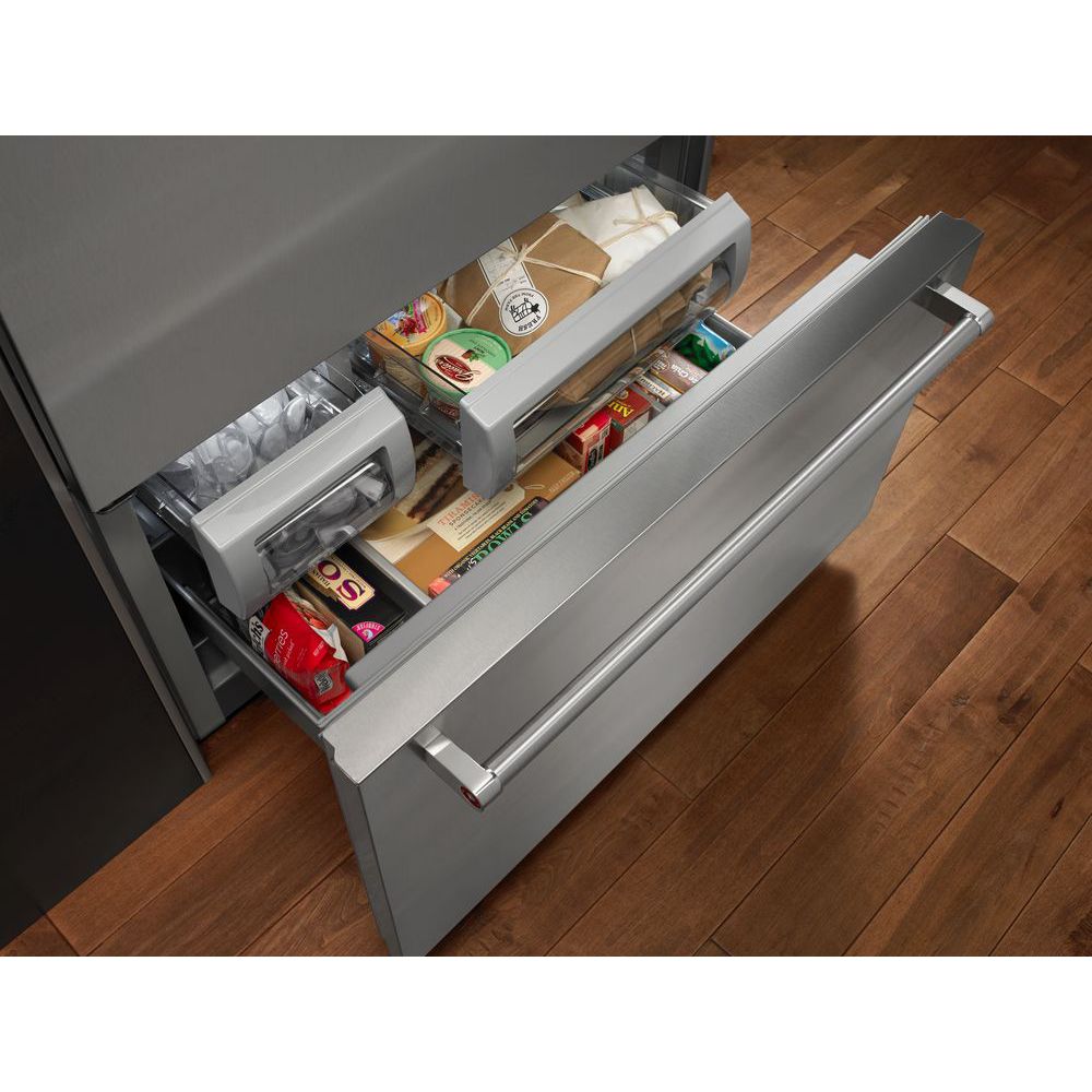 This built-in bottom-mount refrigerator is as beautiful inside as it is outside. The Preserva® Food Care System features three technologies that work in concert to assure crisp produce and deliciously flavorful foods while helping to eliminate refrigerator odors. The exclusive platinum interior design features glossy silver walls that harmonize with the metallic accents on shelves, crisper and baskets of this left-swing door refrigerator.