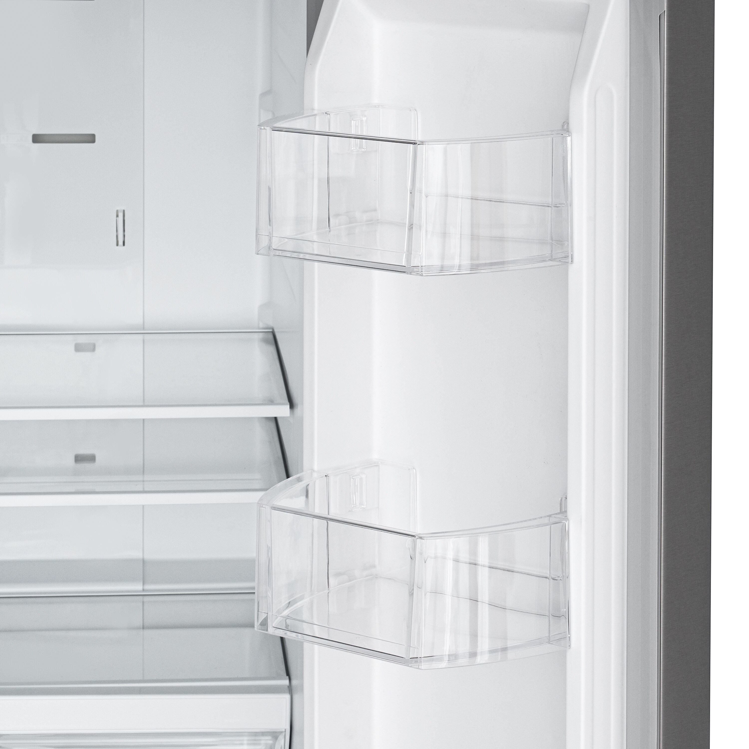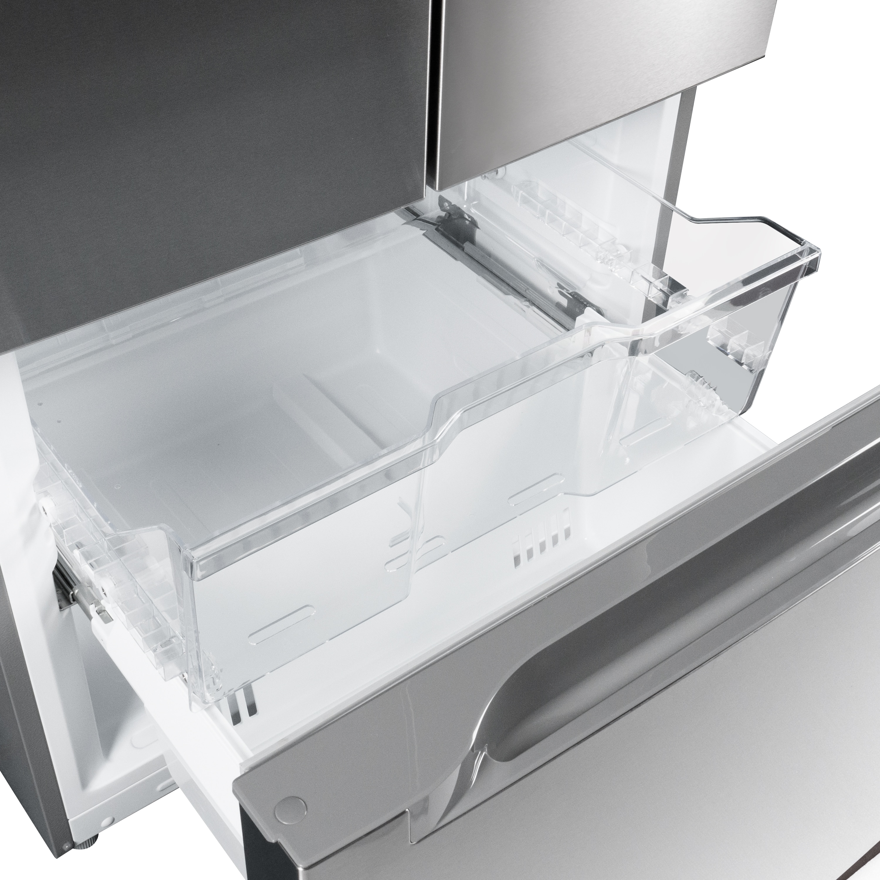 The Koolmore Counter-Depth 18.5 cu. ft. French Door Refrigerator is designed to fit every need in the kitchen. It not only offers a sleek design that fits your home but also all the storage space and little extras you need to support your family. From energy efficiency to temperature and humidity control to expanded freezer space, it’s sure to fill every need from top to bottom. Along with a sleek Stainless-Steel exterior, each Koolmore refrigerator features beautiful see-through shelving on the inside to enhance the look and make it easier to clean. This premium French door fridge with transparent door rack also includes 6 door bins and is designed with two separate large freezer drawers which can store everyday items in the top or deep freezer items in the bottom. The dual crispers also feature humidity control in the produce drawers, which can keep fruits and vegetables, fresher for longer than standard drawers. Each fridge also features heavy-duty feet at the bottom that make it easier to find optimal balance which is important for keeping items from sliding around on shelves. Our tall and spacious yet more compact stainless-steel refrigerator boasts a smooth, elegant design with premium pull handles to make it easier to get into each space with seamless effort.