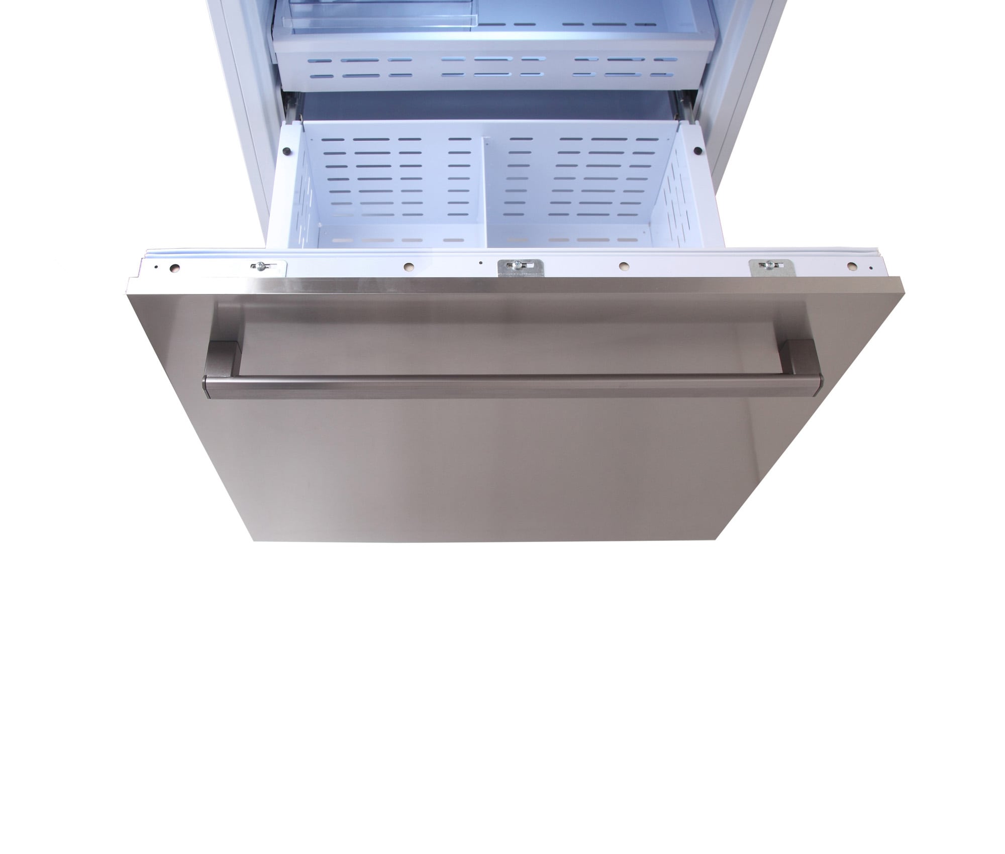 The Kucht KR365SD French Door Refrigerator has a modern and sophisticated aesthetic with a new design of more robust doors. Inside, it is divided with glass shelves to optimize organization and storage. Its total storage capacity is 19.8 cu. ft. The automatic defrost system makes it easy to clean the refrigerator. In addition, it allows a custom panel to be installed on the front face of the appliance that matches the rest of your cabinetry to create a consistent and streamlined look across your whole kitchen.