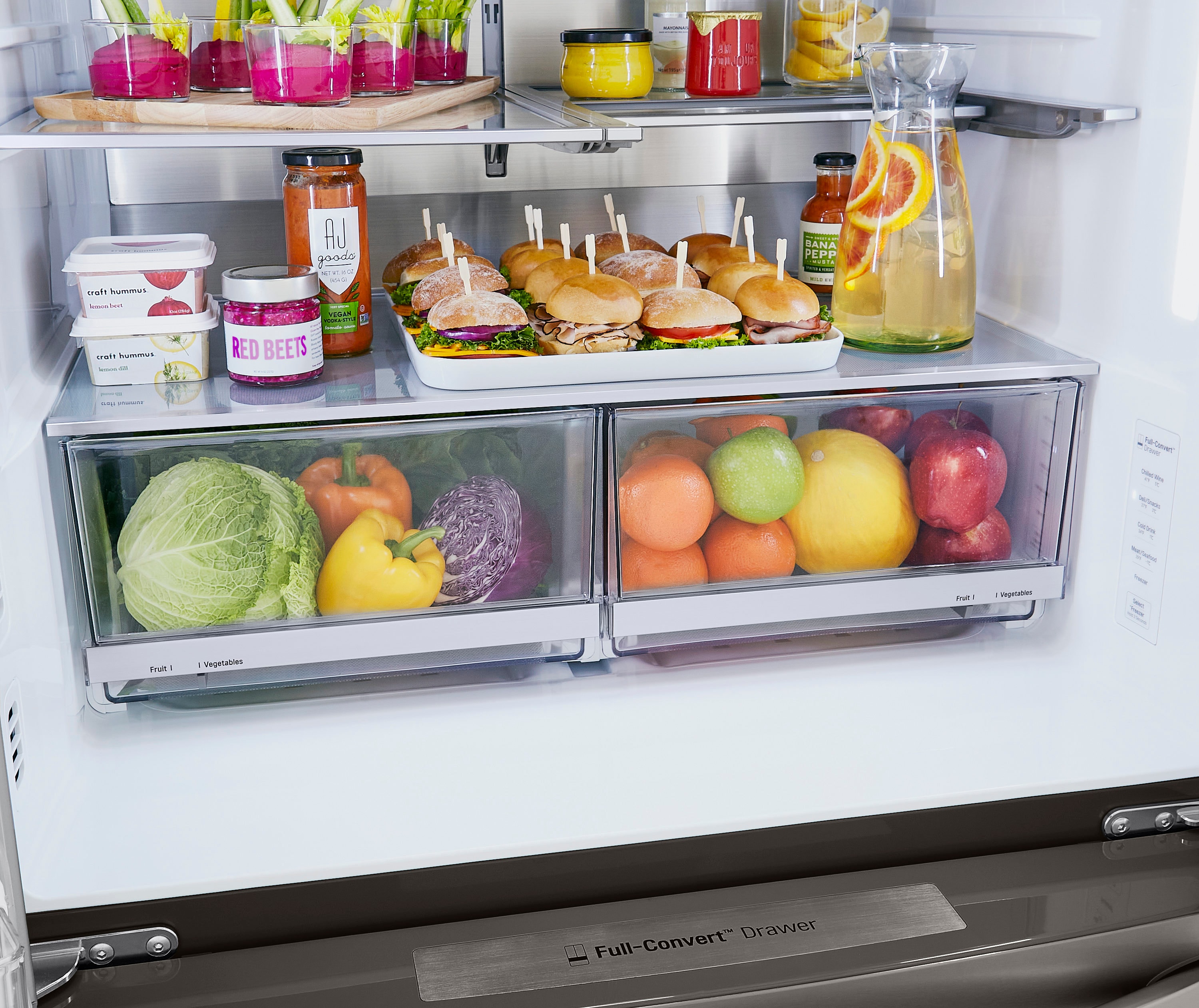 LG’s exclusive Door-in-Door® refrigerators have everything you need to become the ultimate home entertainer. Dual ice makers with Craft Ice™ automatically create crushed, cubed and LG’s exclusive slow-melting round ice for upscale, craft drinks at home—without the work. The Full-Convert drawer gives you more capacity when you need it, with the ability to fully convert from 5 chill to freeze options with one quick touch. To ensure you’re serving guests the freshest foods, innovative LG cooling technologies work together to dramatically extend the life of your produce.