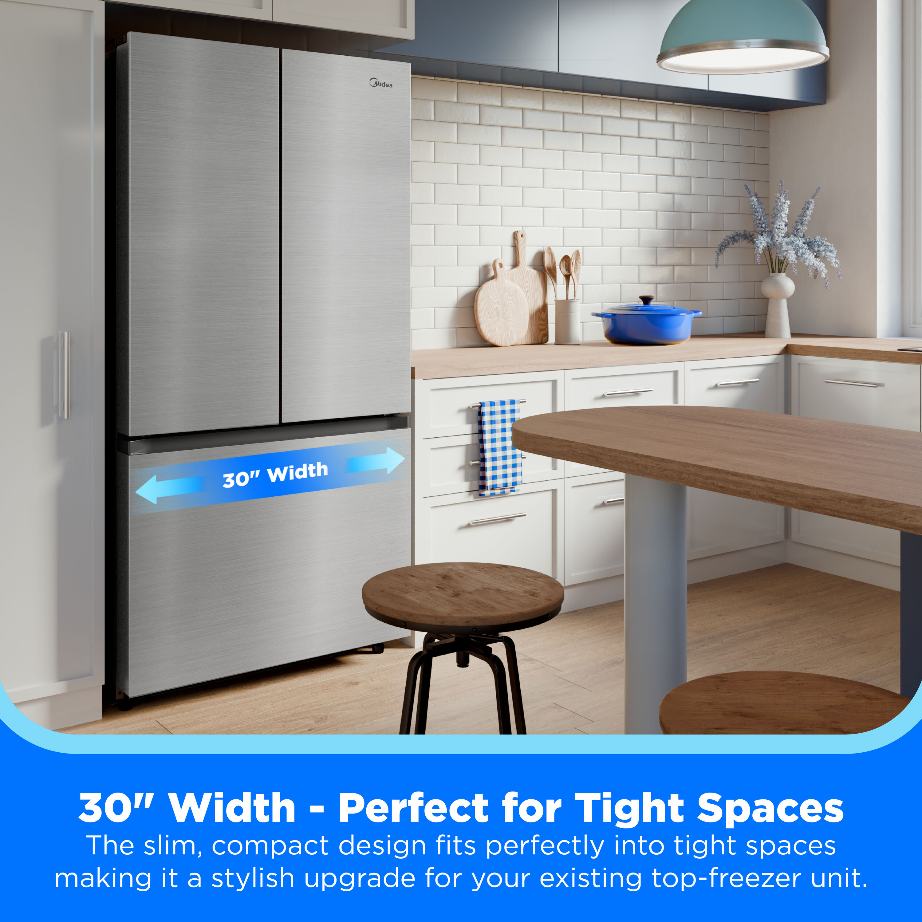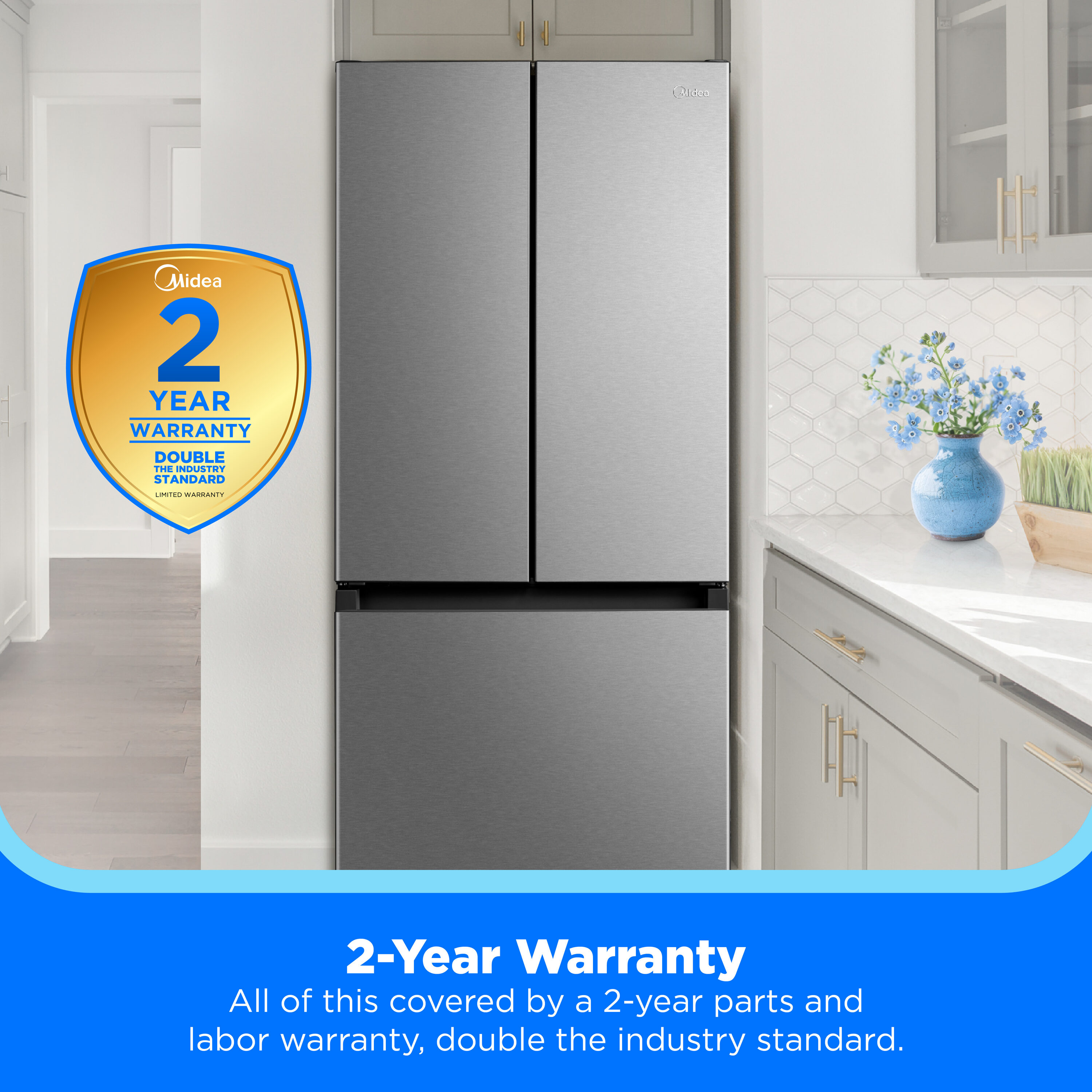 With the Midea 18 cu. ft. French Door Refrigerator, you get a sleek and premium design on a compact footprint. Measuring only 30 inches wide, this refrigerator is the perfect size for upgrading from a top-freezer unit or renovating your small space kitchen. It features a variety of interior drawers and bins to keep food organized and accessible. For added functionality, it comes ice-maker ready so you can easily install a compatible accessory kit in the future. All of this is covered by a 2-year parts and labor warranty, double the industry standard, to provide you with even greater peace of mind.