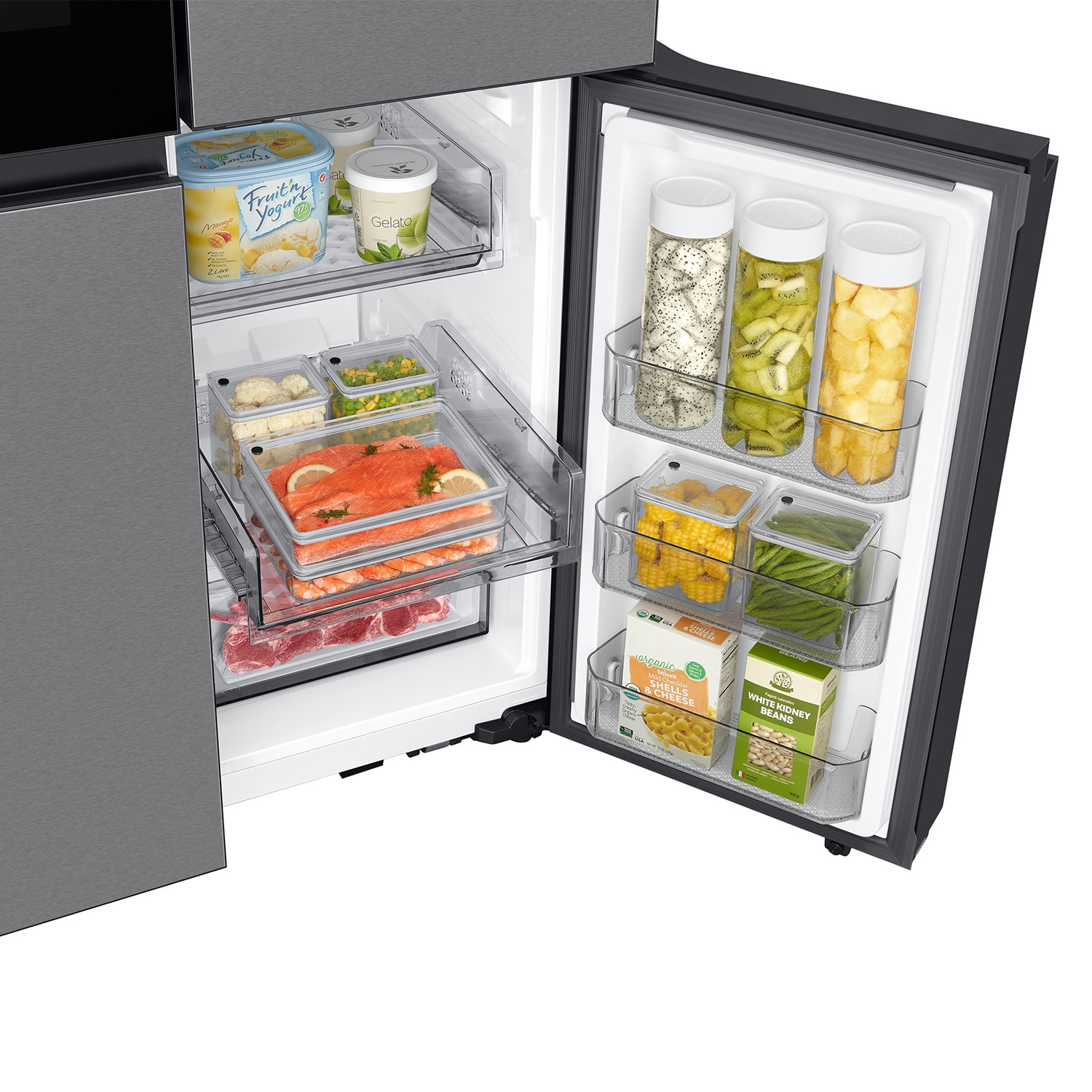Samsung’s Bespoke 4-Door Flex Counter Depth 23 cu-ft Refrigerator features Beverage Zone made for your drink of choice; Choose from two temperature settings for the Beverage Zone, plus get quick and easy access to refreshingly cold water two ways; Open the refrigerator with ease, even if your hands are full with Auto Open Door; With just a light touch of the door sensor, the refrigerator door will open (An automatic closing function is not available; the actual open angle of the doors can be different by the installation circumstances and usage conditions like storing heavy items in the door bins; touch sensors can be turned on/off from the control panel/display, and its default setting is off)