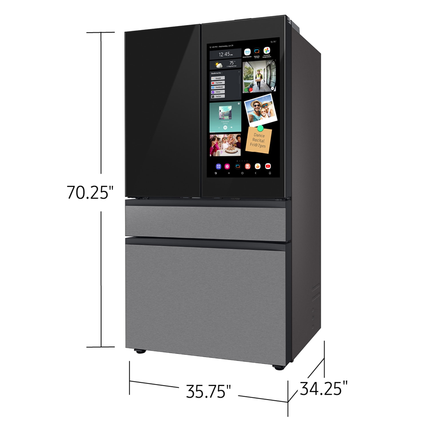 Samsung’s Bespoke 29 cu ft 4-Door French Door Refrigerator features AI Family Hub™+(AI Vision Inside™ accessible through the AI Family Hub™+ utilizes AI-based algorithm); – the entertainment hub with 32″ touchscreen, that’s built into your fridge; AI Vision Inside™ recognizes select items that you put in and take out of your fridge, so you always know what’s inside(AI Vision Inside™ can recognize and automatically label 37 unobscured fresh food items such as select fruits and vegetables; other items may be manually labeled; Results vary by manner of placement); Plus, get quick and easy access to water from inside your fridge with the Inner Beverage Center™.