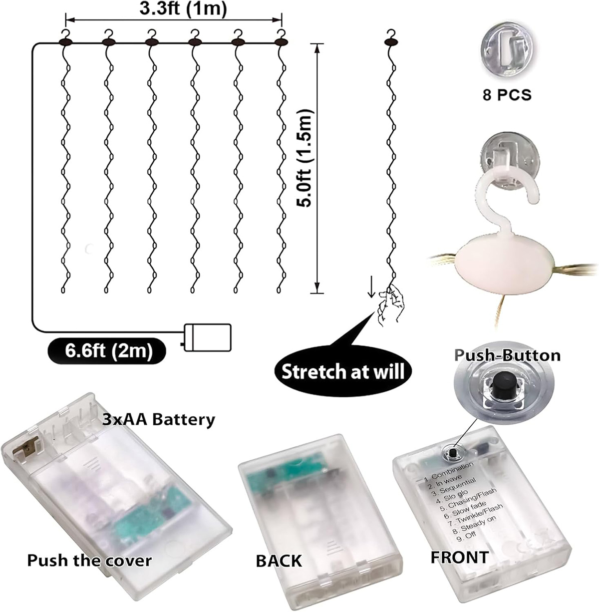- Battery Powered: The short curtain light is powered by 3 AA batteries (Not included) instead of regular plug; That give it a lot more possibilities, portable for outdoor and indoor(the place far away from the socket or power supply) use, available everywhere, movable