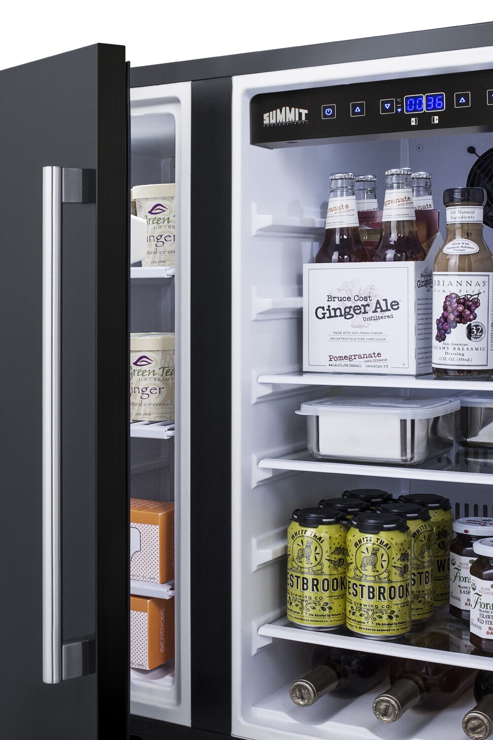 SUMMIT brings quality and value under the counter with a large collection of built-in refrigeration. Sized at 30″ wide, the FFRF3070B is an all-in-one side-by-side refrigerator-freezer. The front breathing design allows built-in installation under counters, while the fully finished cabinet also enables freestanding use. This unit features a jet black exterior with stainless steel handles. Each compartment has a factory installed front lock for added security. The sealed back ensures easier cleanup with added space savings. Inside, the FFRF3070B features a 2.4 cu.ft. frost-free freezer compartment on the left and a 3 cu.ft. frost-free refrigerator compartment on the right. The refrigerator includes a digital thermostat allowing users to manage the temperature in each compartment, with a readout in Celsius or Fahrenheit for added convenience. Adjustable glass shelves offer cleaner spill-proof storage for fresh food items, while two removable door shelves provide additional storage space as needed. An internal fan assures the compartment is cooled evenly from top to bottom. The freezer compartment includes adjustable wire shelves to ensure proper cold air circulation. Both sides feature LED lighting to provide an attractive, energy efficient presentation. The slotted floor design is ideal for keeping bottles safely in place. Additional features include an open door alarm, high temperature alarm, and Sabbath mode setting that allows you to disable certain functions during religious observance. With its innovative all-in-one design, user-friendly features, and full frost-free operation, the FFRF3070B is a great choice for smaller kitchens looking to maximize storage space under the counter.