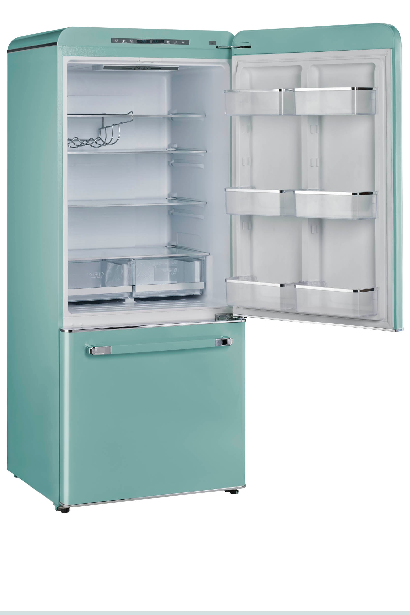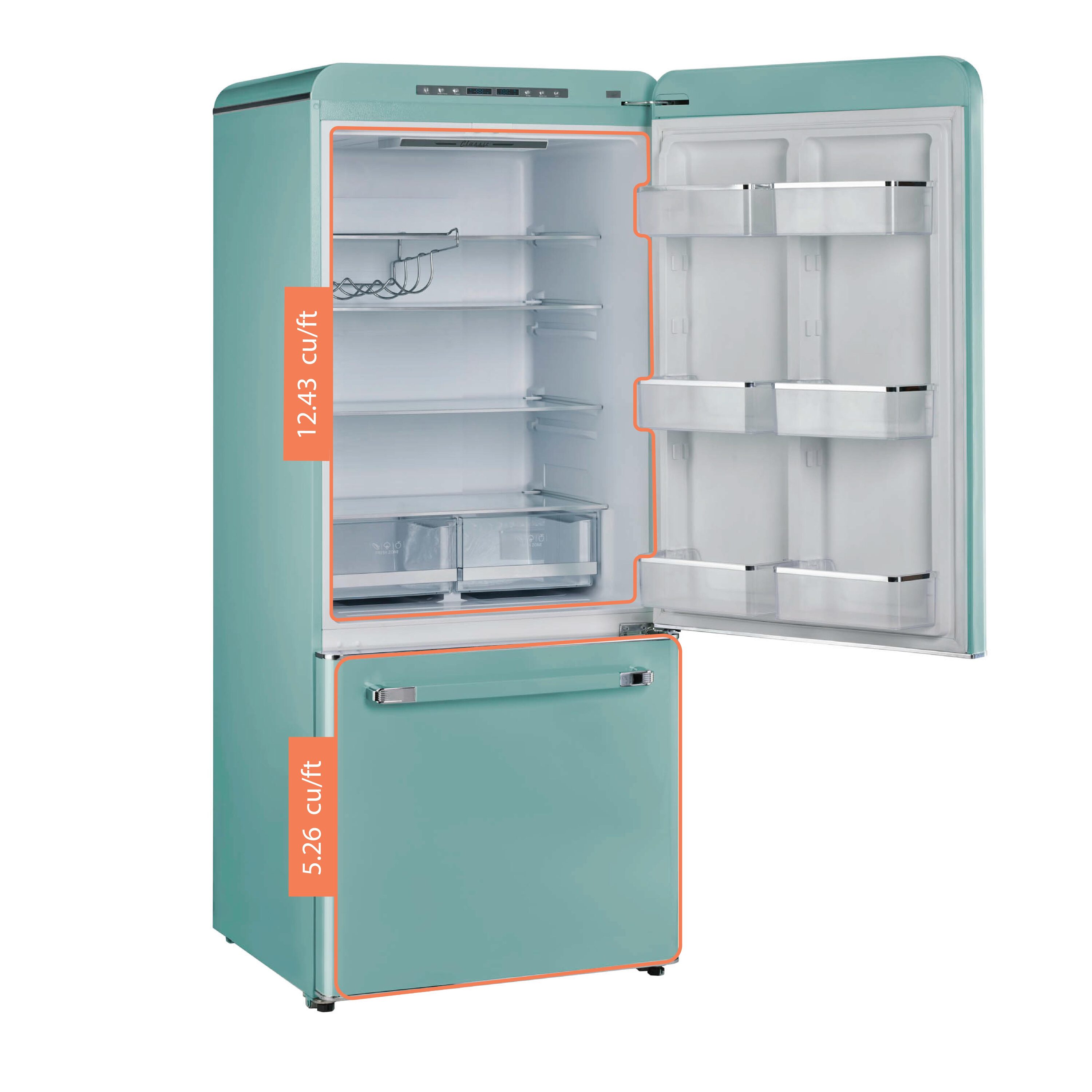 The 18 cu. Ft. Classic Retro counter-depth bottom mount refrigerator is the perfect family sized refrigerator with ample space to keep all your fresh and frozen foods, packaged in an eye-catching throwback design. This refrigerator is energy star certified for energy efficiency all year-round, designed for optimal energy savings and easy, dependable use. Its frost-free design allows easy cleaning without dealing with frost buildup. It also comes with a built-in icemaker. Create a Unique classic retro kitchen!