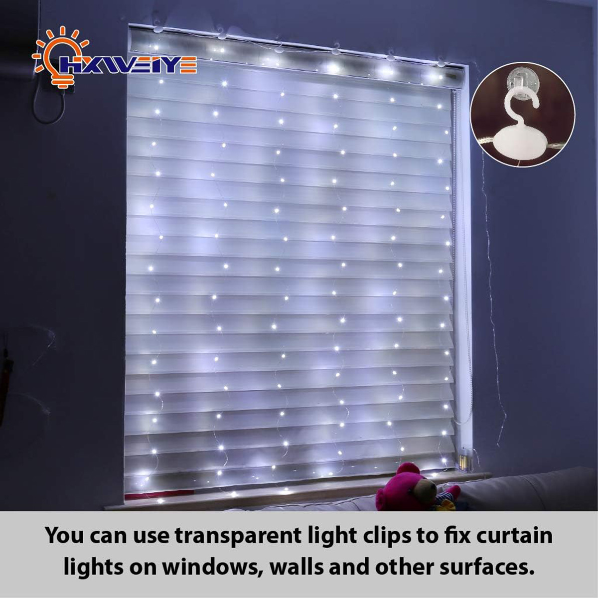- Adhesive Decorating Clips: 6 hooks on the string curtain lights and attached another 8 sets of Damage-free adhesive hooks for easy installation; No nails needed and holds strongly & removes cleanly; Simpler & easier for those some special places need to be hang ligh; Install anywhere you want