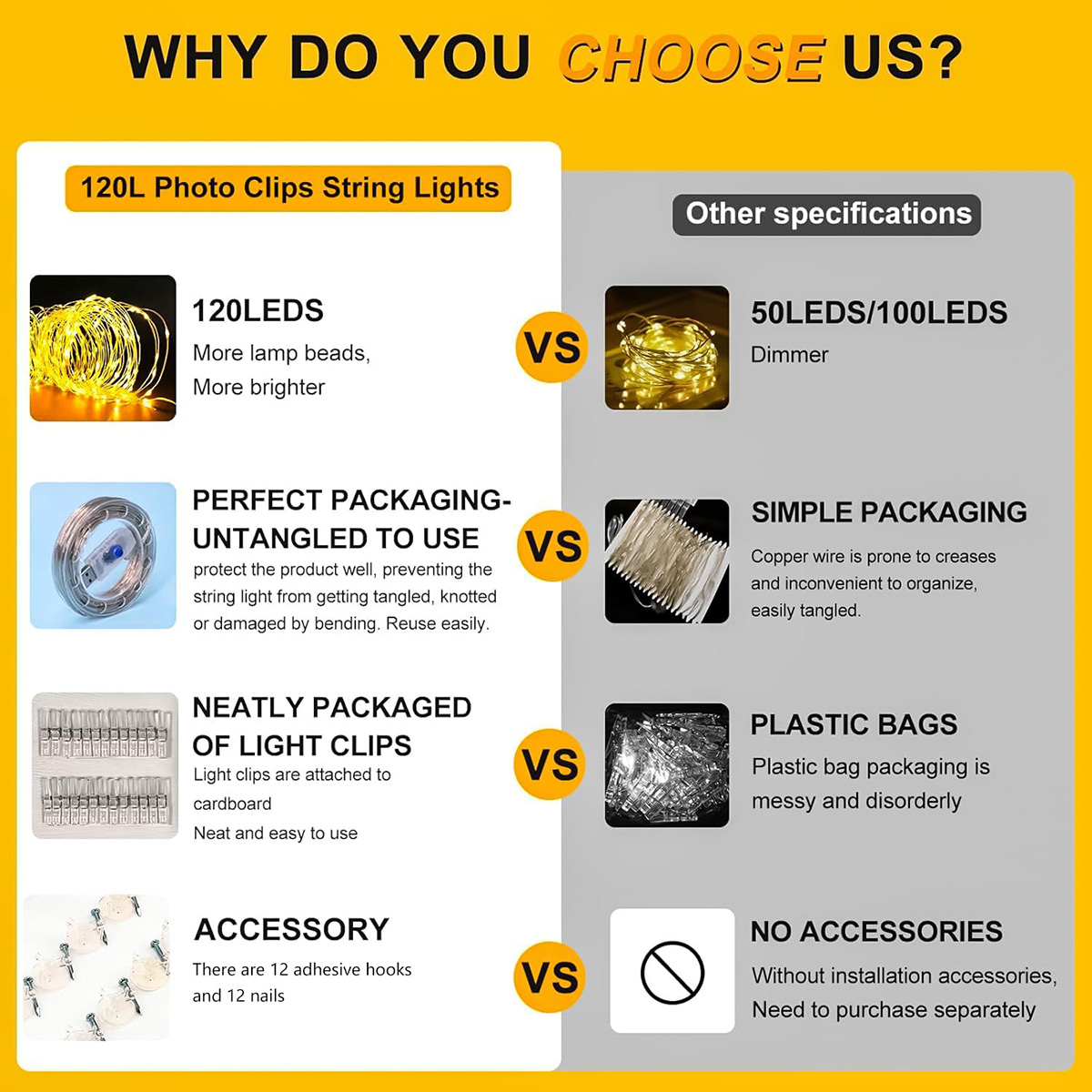 - Upgrade 120LED Photo Clips String Light: Our Copper Wire Fairy String Light have 120LED; Total 40ft long with extra 10ft long power cord; And 10cm distance between LED bulbs, allowing you to free adjustment any sizes on the led string lights for picture