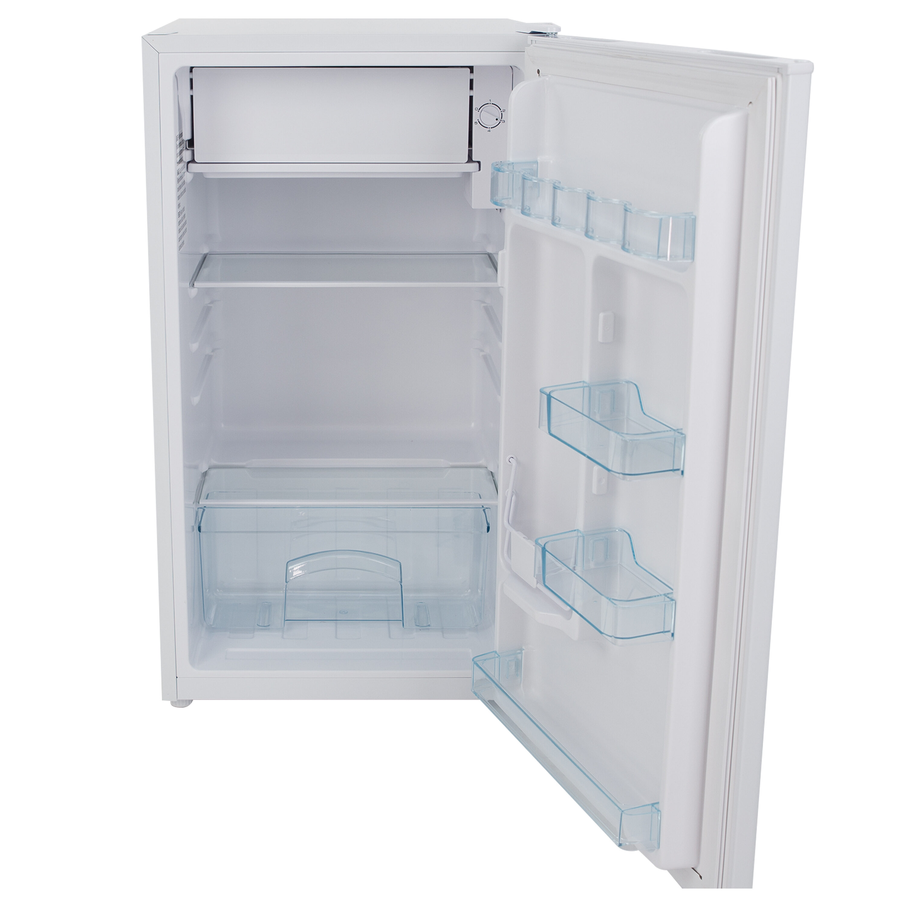 This refrigerator accommodates a variety of foods and beverages. the interior includes two removable, adjustable glass shelves and 2 liter bottle storage in the door. It features full range temperature control and a reversible door. The chiller compartment is great for short-term storage. Capacity (Volume): 3.3 cu ft; Width: 18-1/2-in; Depth: 17-1/2-in; Height: 33-1/2-in.