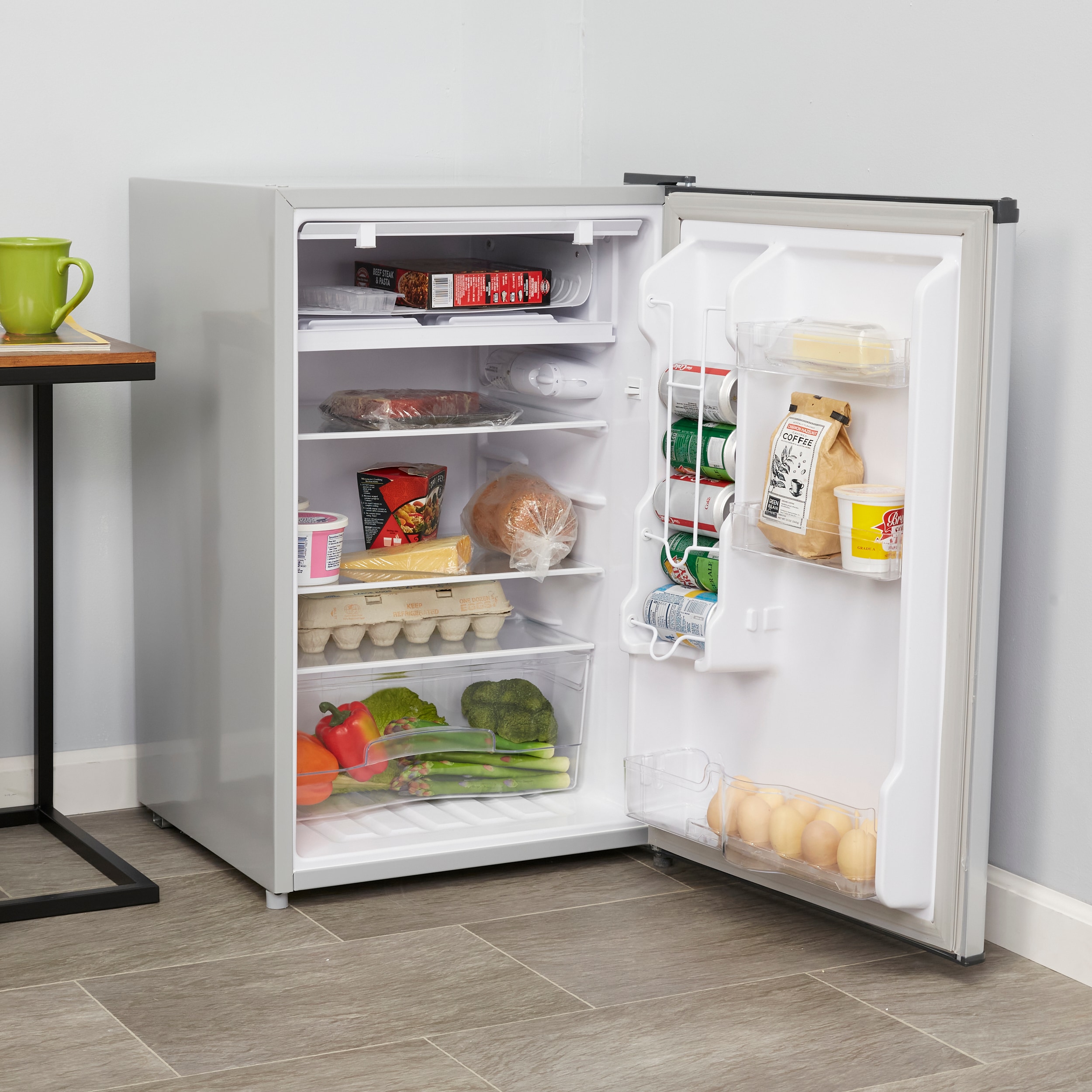 This BLACK+DECKER energy star certified compact refrigerator was perfectly designed for all small places; college dorm room, office, bedroom, workshop or anywhere you may need a compact refrigerator to keep your beverages and food cold. Similar to a regular refrigerator it comes with a full width freezer compartment with ice cube tray, a full width crisper with cover, recessed door handle, manual defrost and adjustable thermostat control. Easily accommodates 2 liter and other tall bottles.