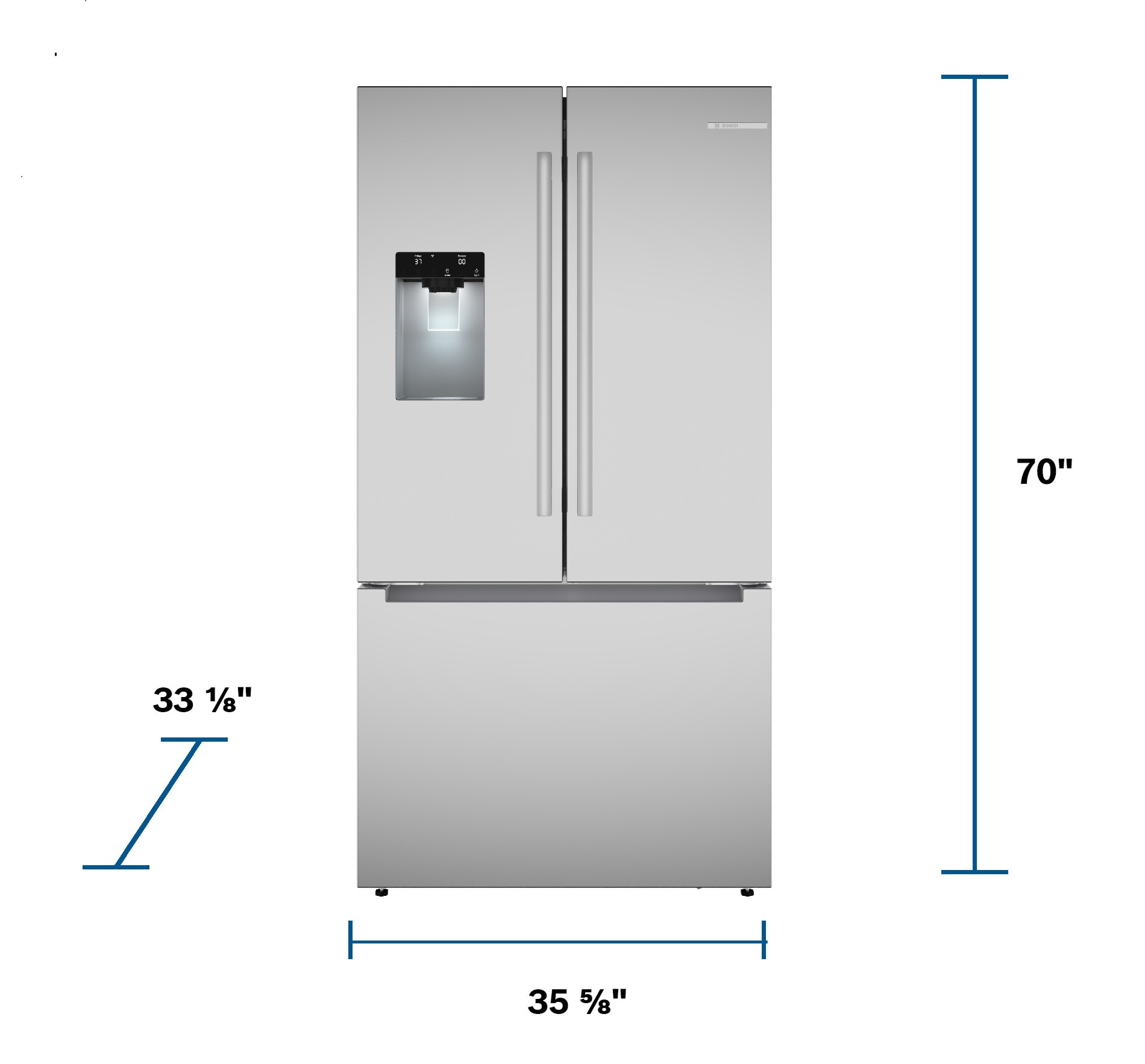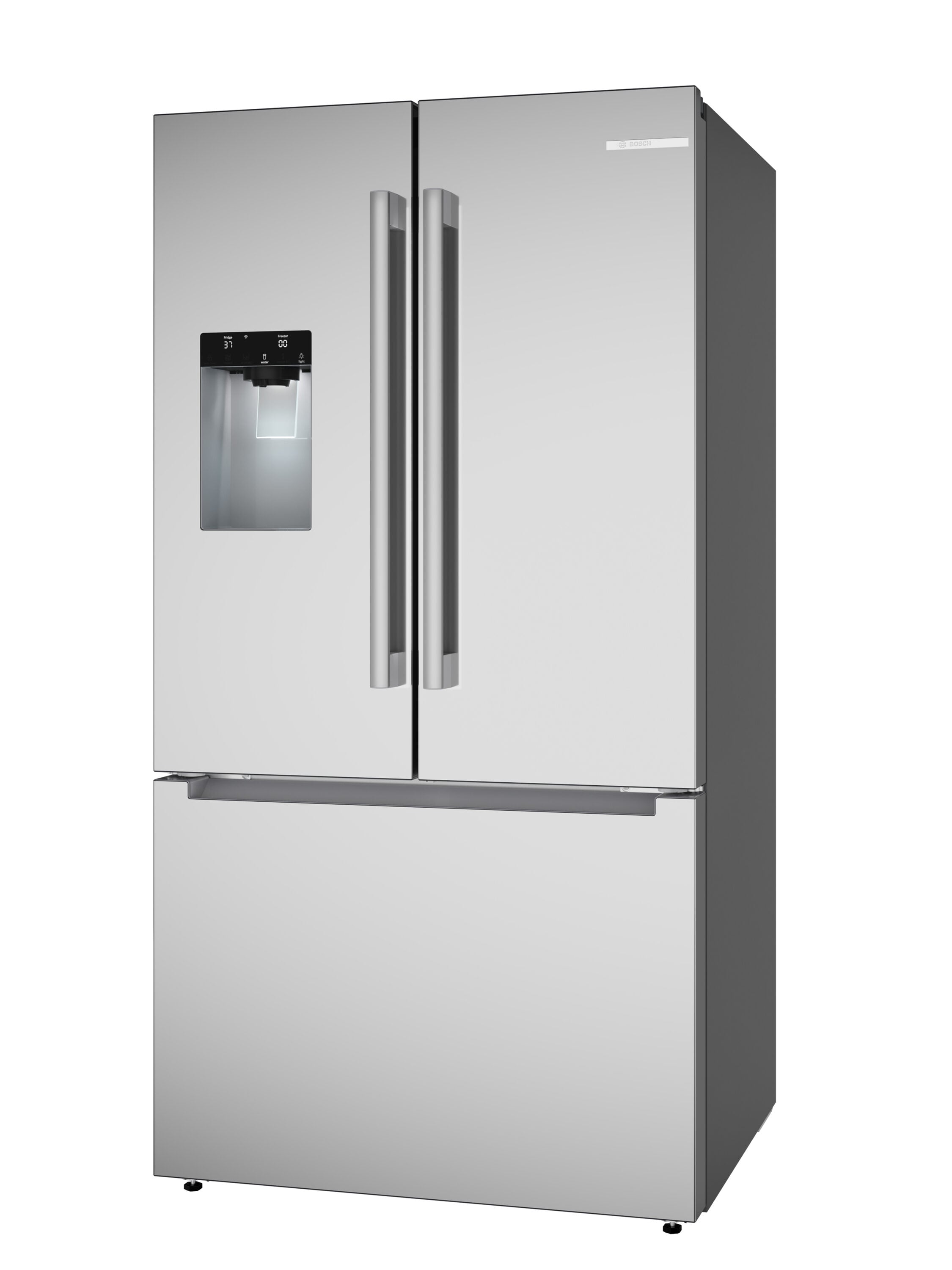 Introducing the Lowe’s Exclusive Bosch 300 Series standard-depth refrigerator, featuring the industry’s fastest refrigerator ice maker; Bosch’s QuickIcePro system produces 10 lbs of freshly filtered ice per day; The external ice and water dispenser also accommodates oversized drink containers; Based on single ice maker production rates during a 24-hour period, measured per IEC standard, manufacturer user’s manuals and product specifications, for brands identified in US Yipit Top 10 as freestanding French door bottom mount refrigerators.
