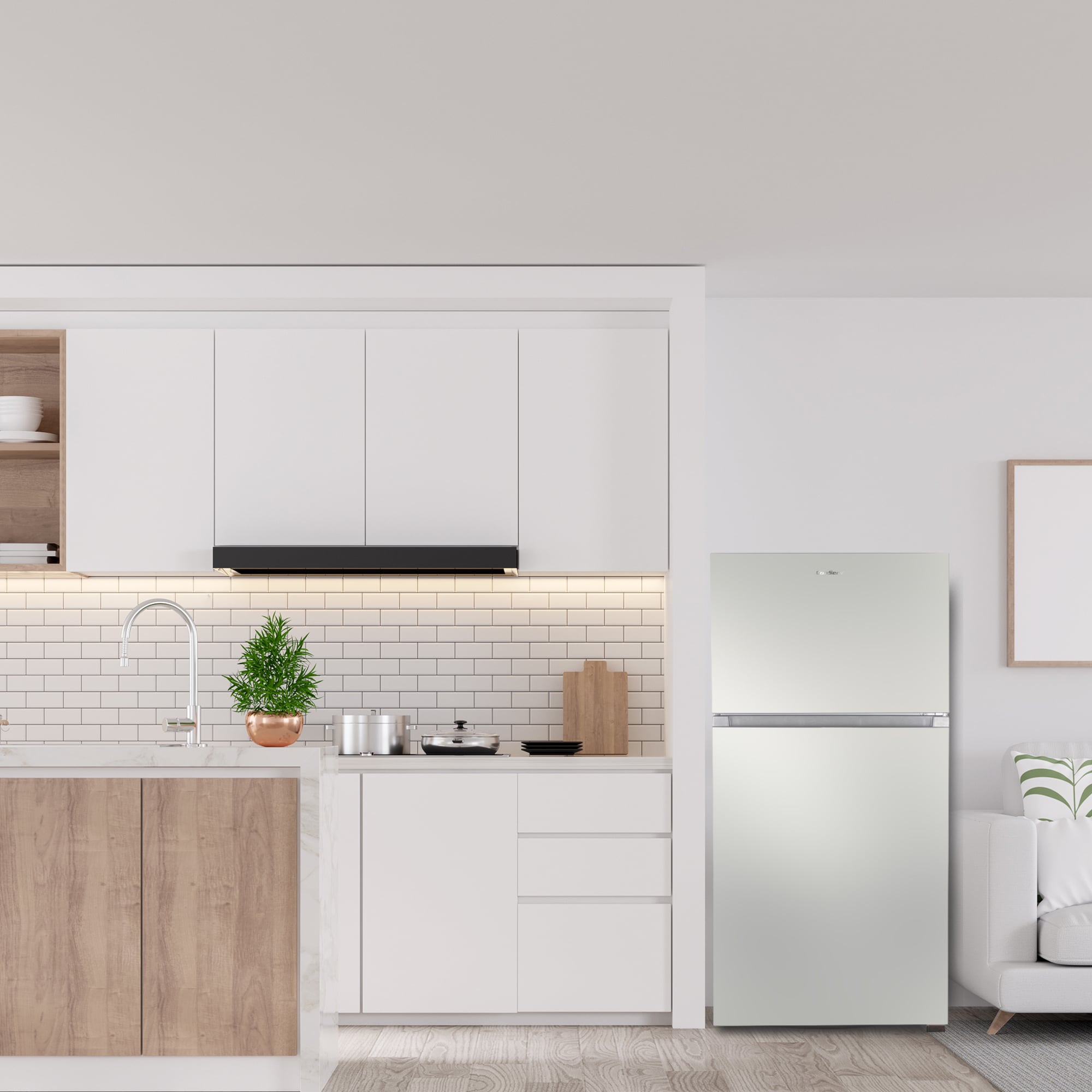 Equipped to meet all of your cooling needs, the ConServ TMRI 210 S Top Mount Refrigerator with Ice Maker provides expanded storage and convenient features. Offering 21 cubic square feet of space, and measuring 66.4 x 29.5 x 30.75 (HxWxD in inches), this model allows you to store all of your favorite foods and beverages at the same time. Energy Star rated and designed with an energy efficient compressor, the TMRI 210 S helps you cut down on your daily electricity usage. Inside this model, keep everything organized with four door shelves, gallon storage, a butter box, one freezer shelf, and two adjustable glass refrigerator shelves. Fit this top mount unit into any space thanks to its reversible door, adjustable feet, and freestanding design. The factory installed ice maker Enjoy the added benefits of a bright interior light, replaceable door gaskets, frost free interior, a fingerprint resistant exterior, a factory installed automatic ice maker, and electronic temperature control.