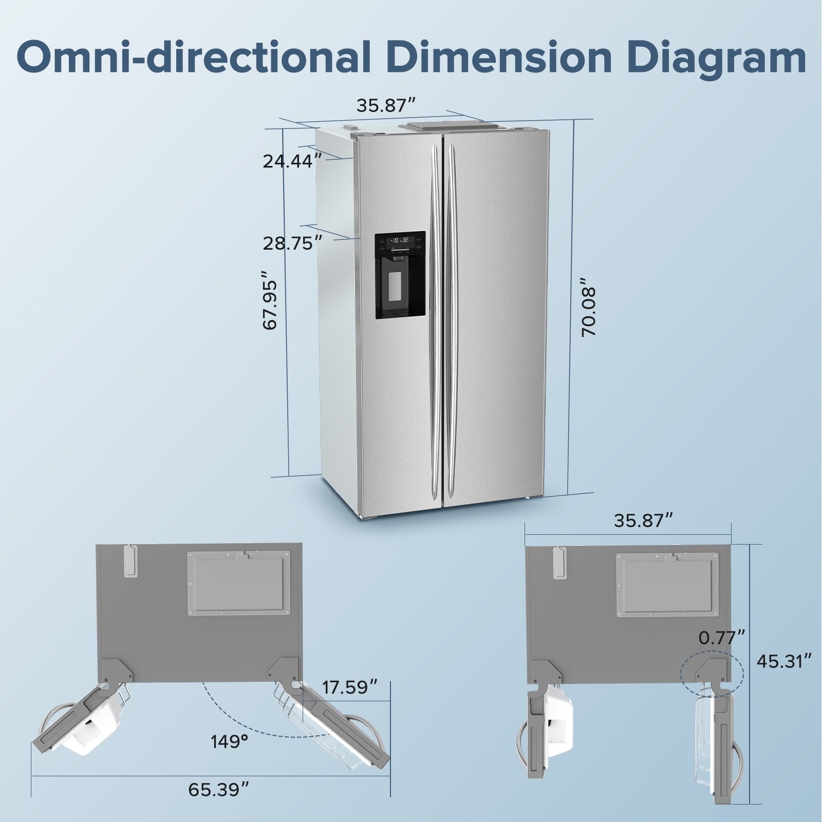 COWSAR 20 CU.FT. 2-in-1 side by side refrigerator with ice maker, with its remarkable performance in large capacity, multi-functionality and intelligence, will bring you a more convenient and comfortable life experience. Boasting a fresh food capacity of 13.48 cu. ft. and a freezer capacity of 6.53 cu. ft., it offers ample space with efficient organization. The fresh food compartment includes 4 spill-proof glass shelves, 2 plastic bins, and 4 door racks, while the freezer features 3 spill-proof glass shelves, 2 storage drawers, and 2 door bins. Besides that, it includes a ice storage box and water/ice dispenser. This side by side refrigerator can be used as an ice maker, which can produce 3.3lbs ice cubes/nugget ice cubes per 24 hours. It can be also dispensed cold water. The Effortlessly adjust temperatures with LED touch controls. Fast cool and fast freeze preserve freshness with rapid temperature setting(Max temp 43°F). High-efficiency LED lighting to illuminate every corner. The compressor inverter ensures energy efficiency, quiet operation, and precise temperature control. See-through drawers and door bins enhance organization. Upgrade your kitchen with COWSAR refrigerator– where innovation meets elegance, guaranteeing freshness at your fingertips, expecting it to brighten up your life. Please free standing place the refrigerator in a well-ventilated place, reserve 5-12 inch space around and behind the refrigerator, and do not cover or block the air grille on the rear cover plate of compressor at the back of refrigerator.