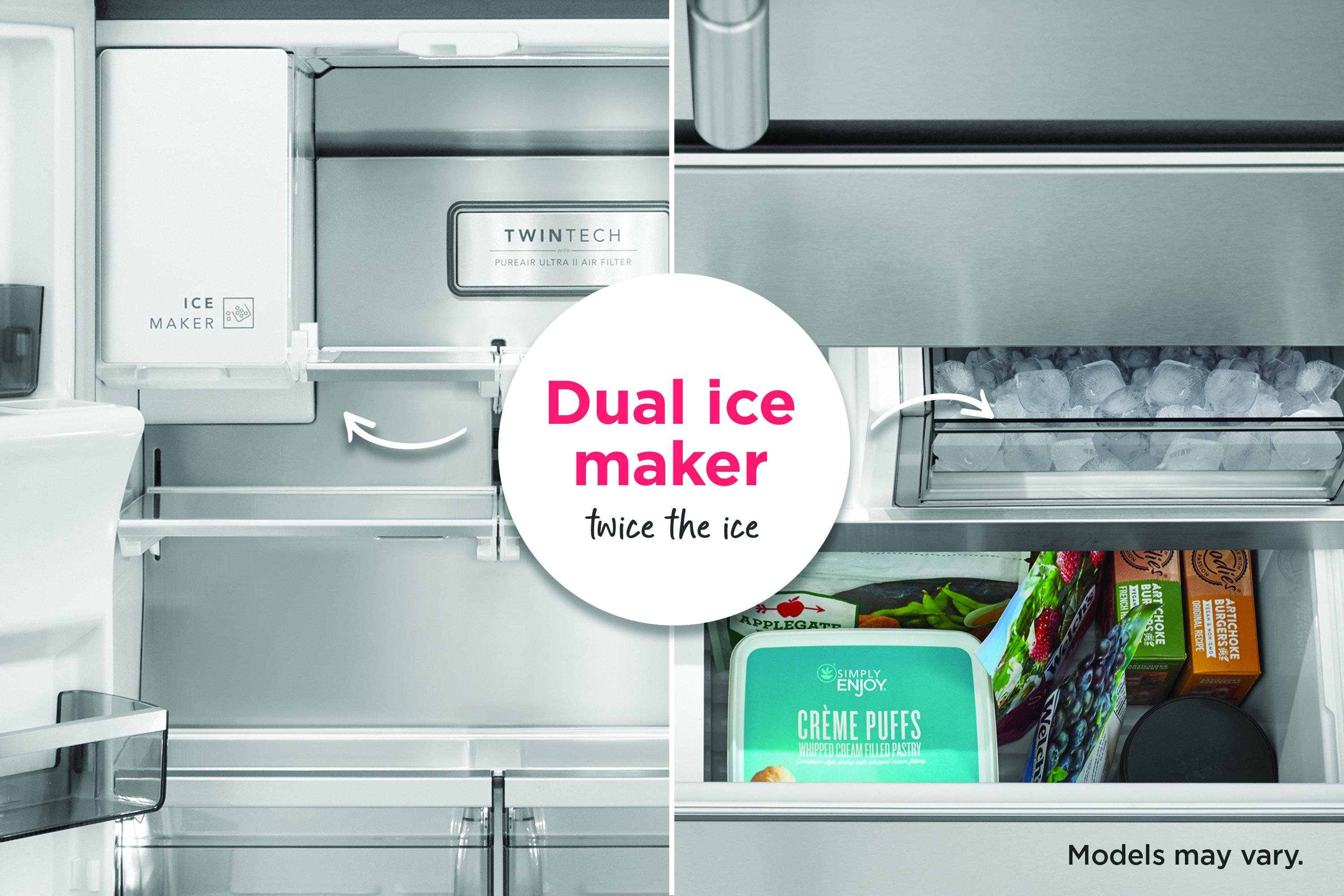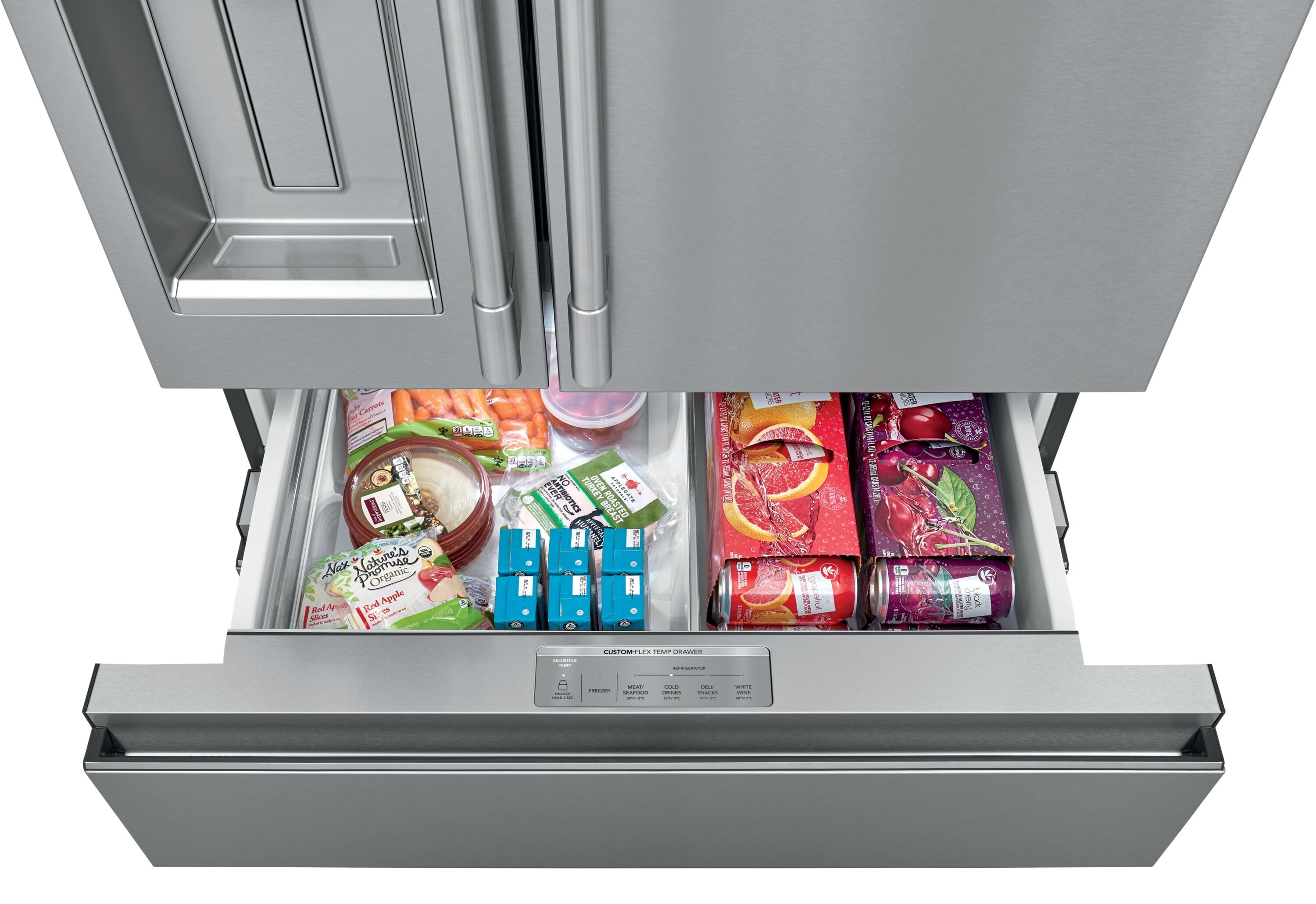 This Frigidaire four-door French door refrigerator offers the Custom-Flex® Temp Drawer, the only drawer available that fully switches from frig to freezer, so you can store all your family favorites from yogurt to frozen pizza. It helps keep fruits and vegetables fresh longer with CrispSeal® crispers, and it’s easy to organize and clean with SpaceWise® organization system and Smudge-Proof® stainless steel.