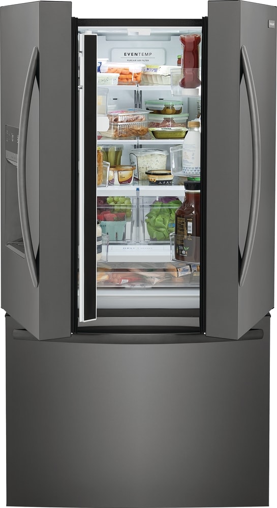 This Frigidaire French door refrigerator helps keep fruits and vegetables fresh longer with CrispSeal® crispers which blocks dry air from entering your crisper to avoid premature shriveling. Easily stay organized with a full width deli drawer and large door bin storage. Keep safe, great tasting water flowing. Our filter reduces up to 99% of contaminants, cuts back on plastic and saves the cost of bottled water (NSF and WQA certified).
