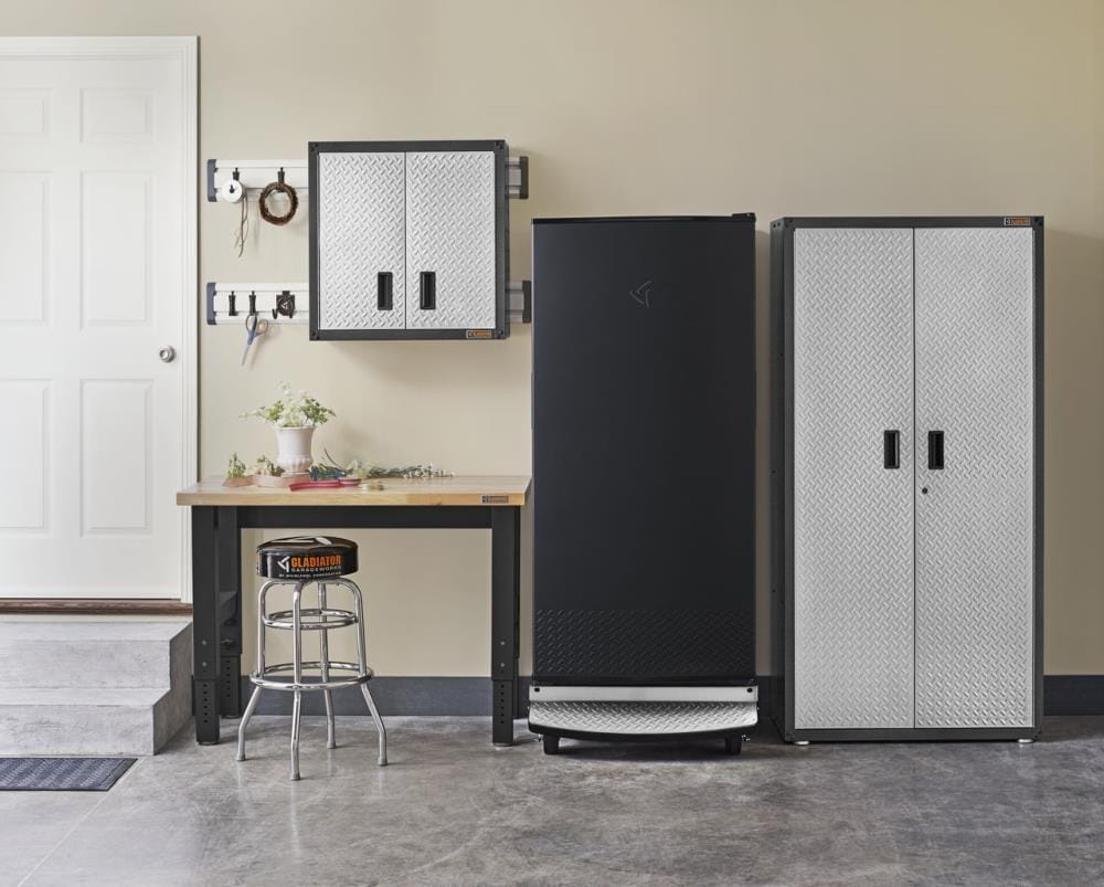 Hammered granite cabinet and matte black door finish create the perfect look for the garage
