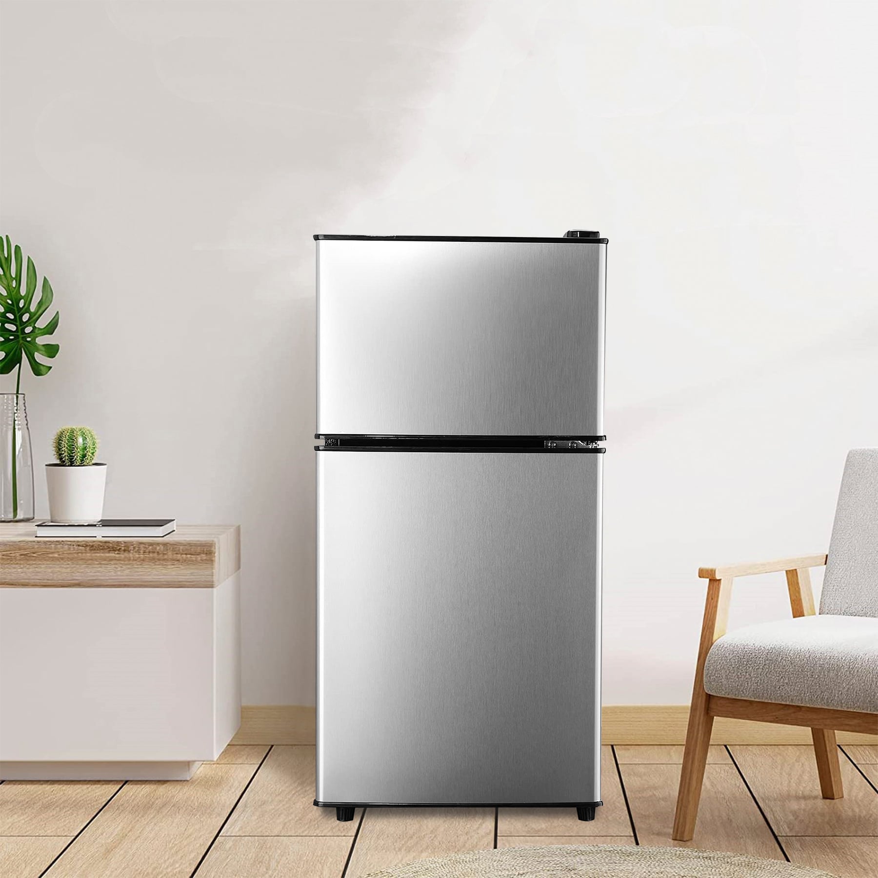 This 3.5 cu.ft mini fridge is ideal for use in bedrooms, offices, apartments and bars. Double circulation zone cooling and double circulation zone cooling can isolate the outside heat, effectively maintain the temperature in the box, and improve the effect of food preservation. When the ambient temperature is below 0 degree, turn on the switch to make the refrigerator work passively, so that the temperature of the freezer is kept in the state of low temperature freezing. Double door design can keep fresh ingredients, lock food moisture, fruits and vegetables, drinks, snacks, etc. Fast refrigeration to lock in the nutrients of the ingredients; Storage: Fish, seafood, meat, ice cream, etc.