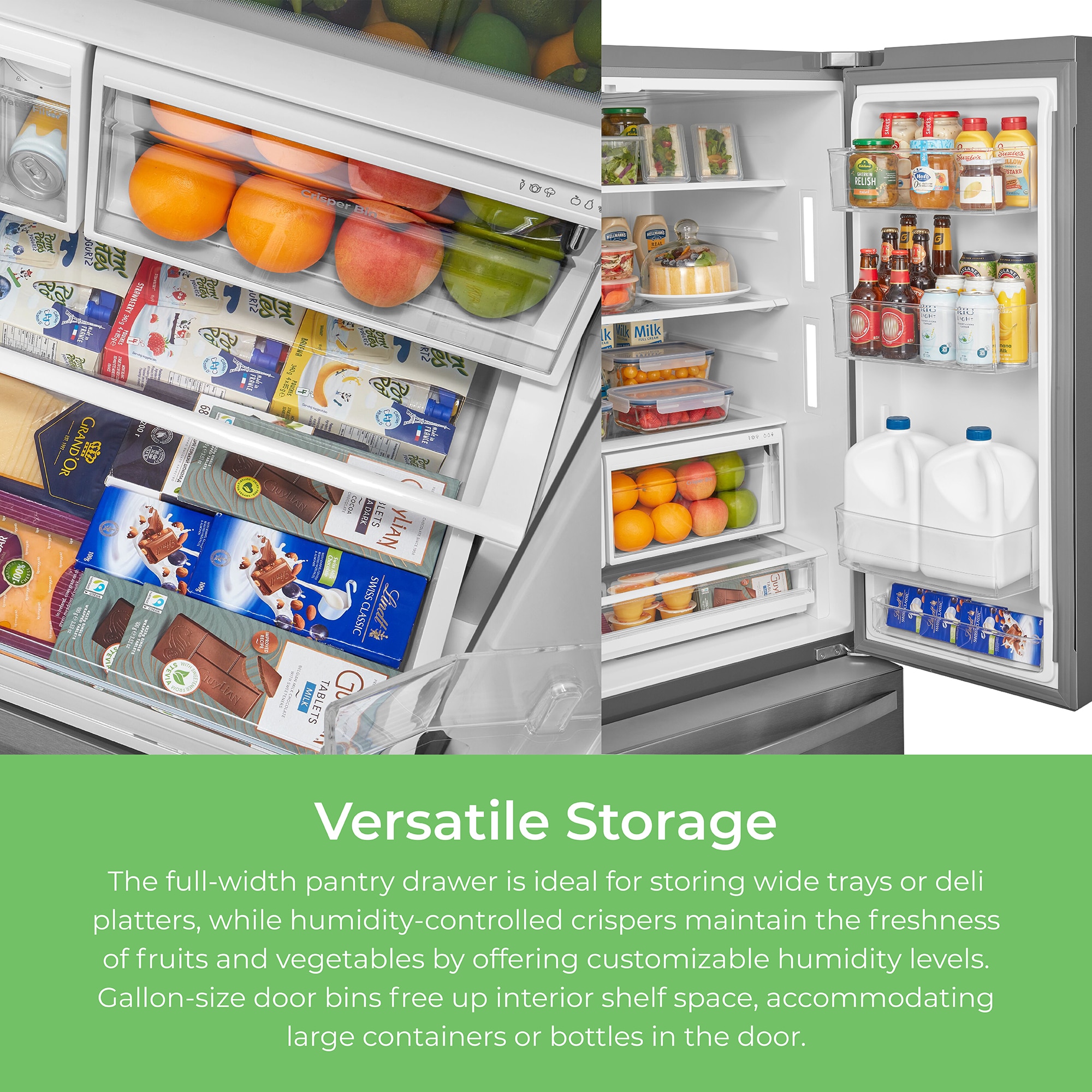 Full-width pantry drawer, humidity-controlled crispers, adjustable shelves, and foldable shelf for flexible storage