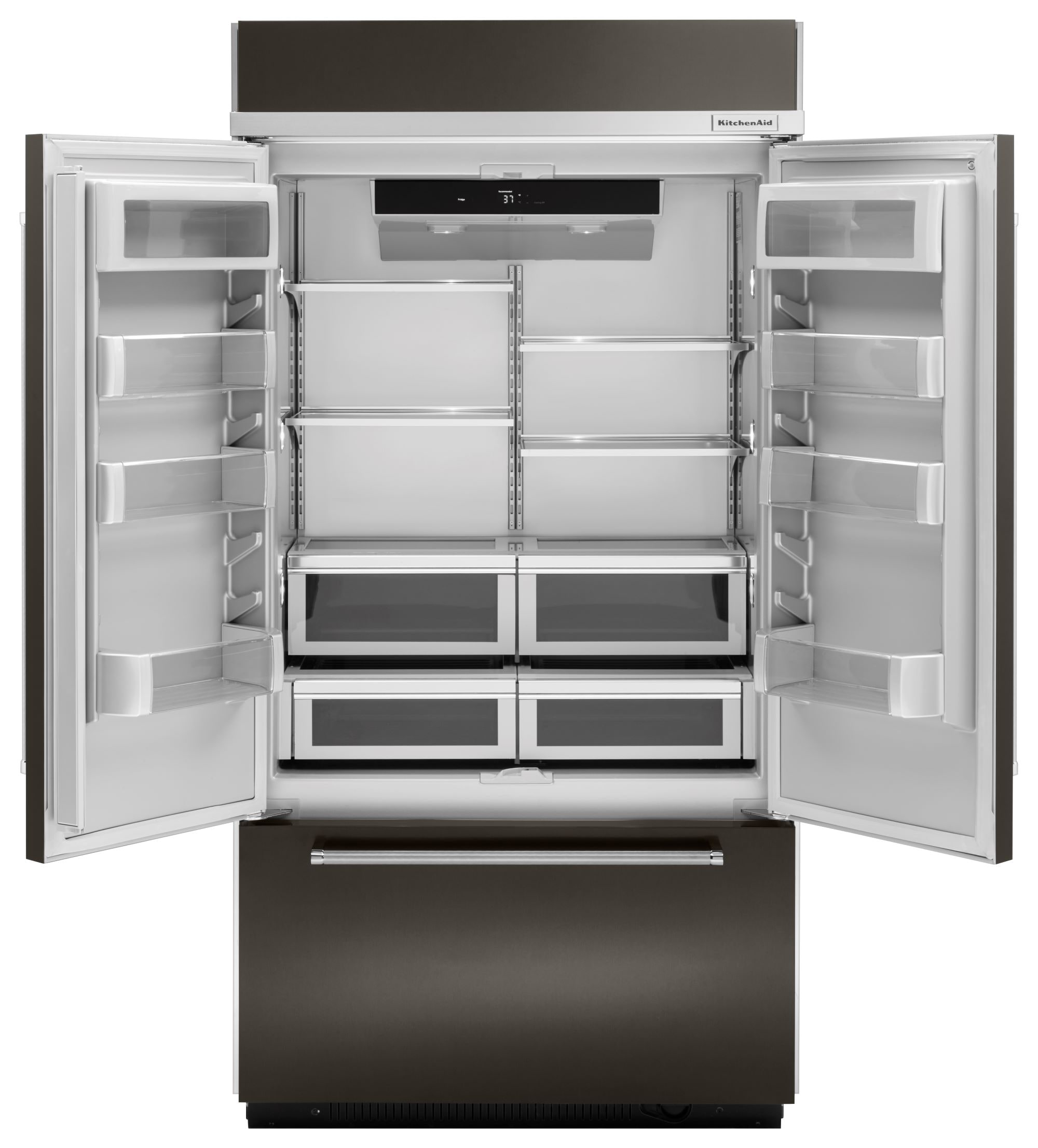 Behind these built-in French doors lie performance and beauty. The Preserva® Food Care System features three technologies that work in concert to assure crisp produce and deliciously flavorful foods while helping to eliminate refrigerator odors. The glossy silver Platinum Interior Design complements the metallic accents on shelves, crisper and baskets while the SatinGlide® System with Soft-Close assures their smooth operation.