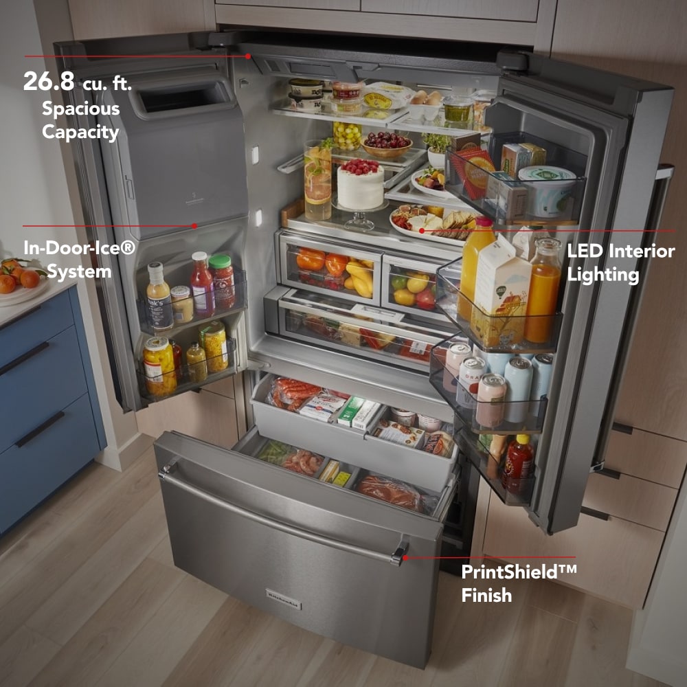 This standard-depth French door refrigerator from KitchenAid® brand keeps ingredients fresh and in easy reach with specialized spaces that make room for everything from salmon to sangria. A Sliding Storage Tray fits platters and casserole dishes without stacking, while a Slide-Away Shelf adjusts to accommodate tall pitchers and carafes. Plus, the ExtendFresh™ Temperature Management System maintains optimal temperatures for fresh and frozen foods.