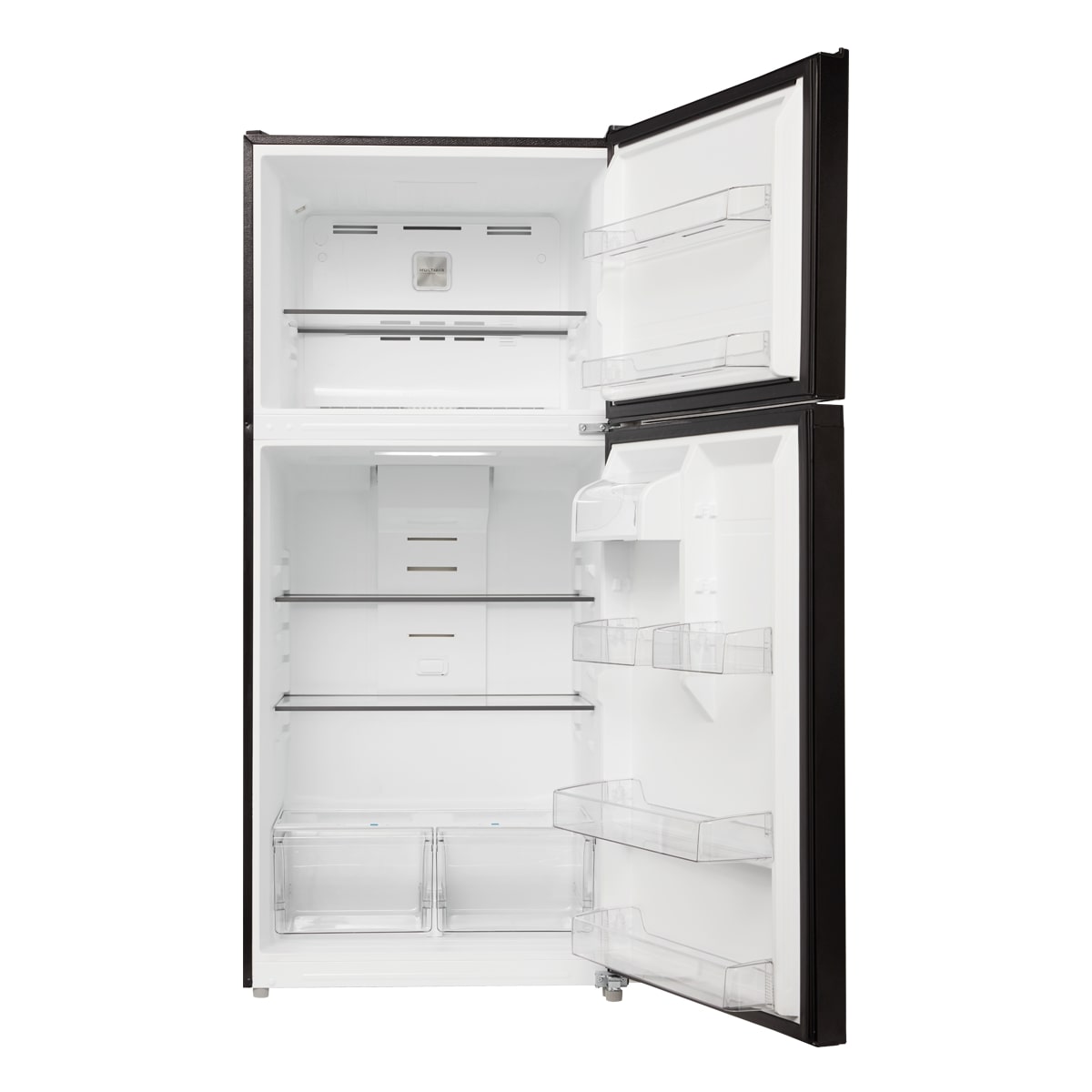 Upgrade your kitchen with the Midea 18.1-cu ft Top-Freezer Refrigerator (Black), which offers both a wide range of convenient features and energy-efficient performance. The internal LED lighting ensures that you can always find what you’re looking for, while the electronic control panel makes temperature adjustments a breeze. Humidity-controlled crisper drawers keep your produce fresh, and the reversible door allows for flexible installation. The top-freezer design puts frozen foods at eye level for easy access. Bring home this refrigerator today to optimize your food storage capabilities and keep your kitchen running smoothly.