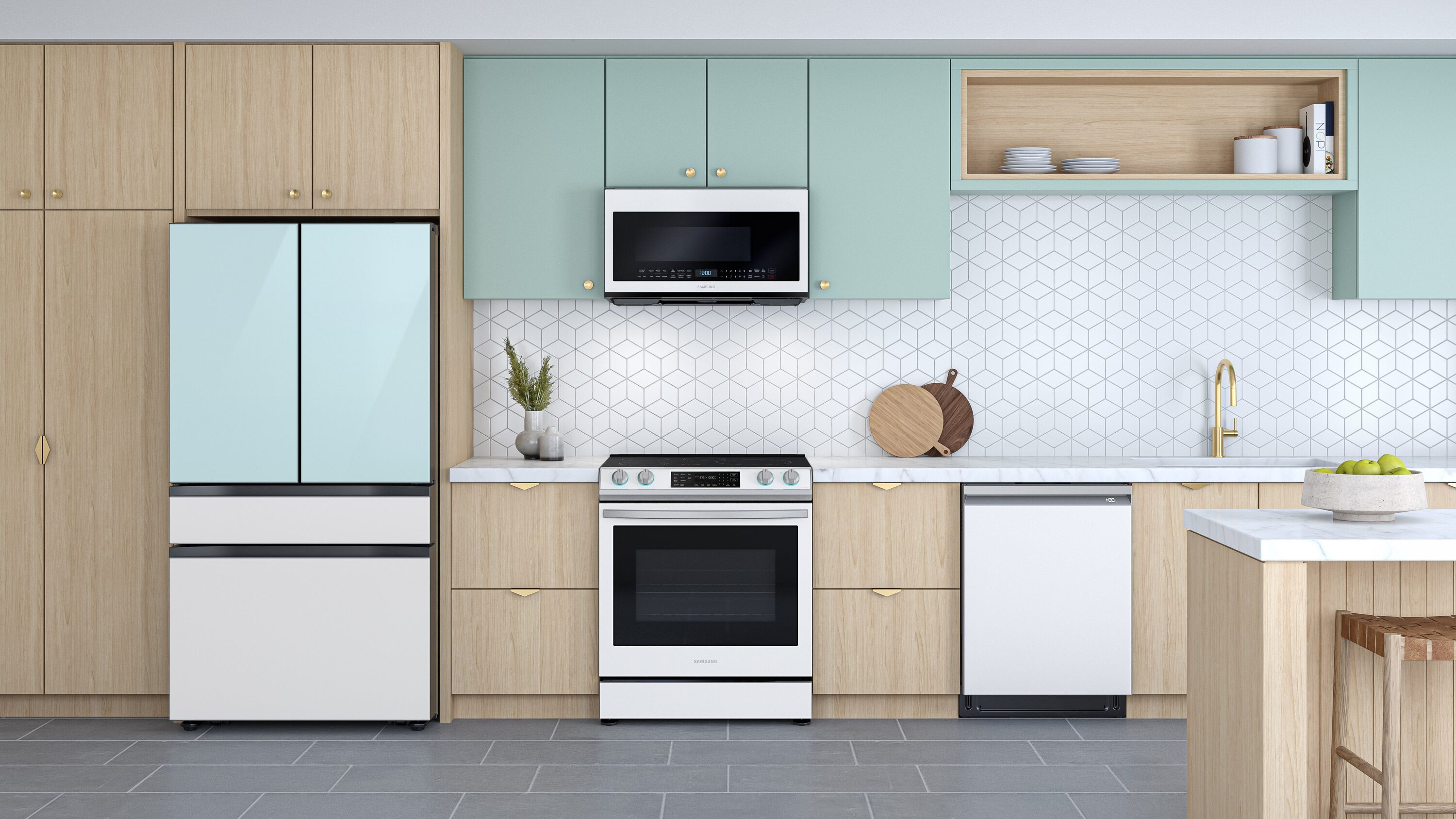Samsung Bespoke Standard-Depth Beverage Center 28.8-cu ft 4 -Door Smart Compatible French Door Refrigerator with Dual Ice Maker with Water Dispenser and Door within Door ( Morning Blue with White Glass Panels ) ENERGY STAR Certified