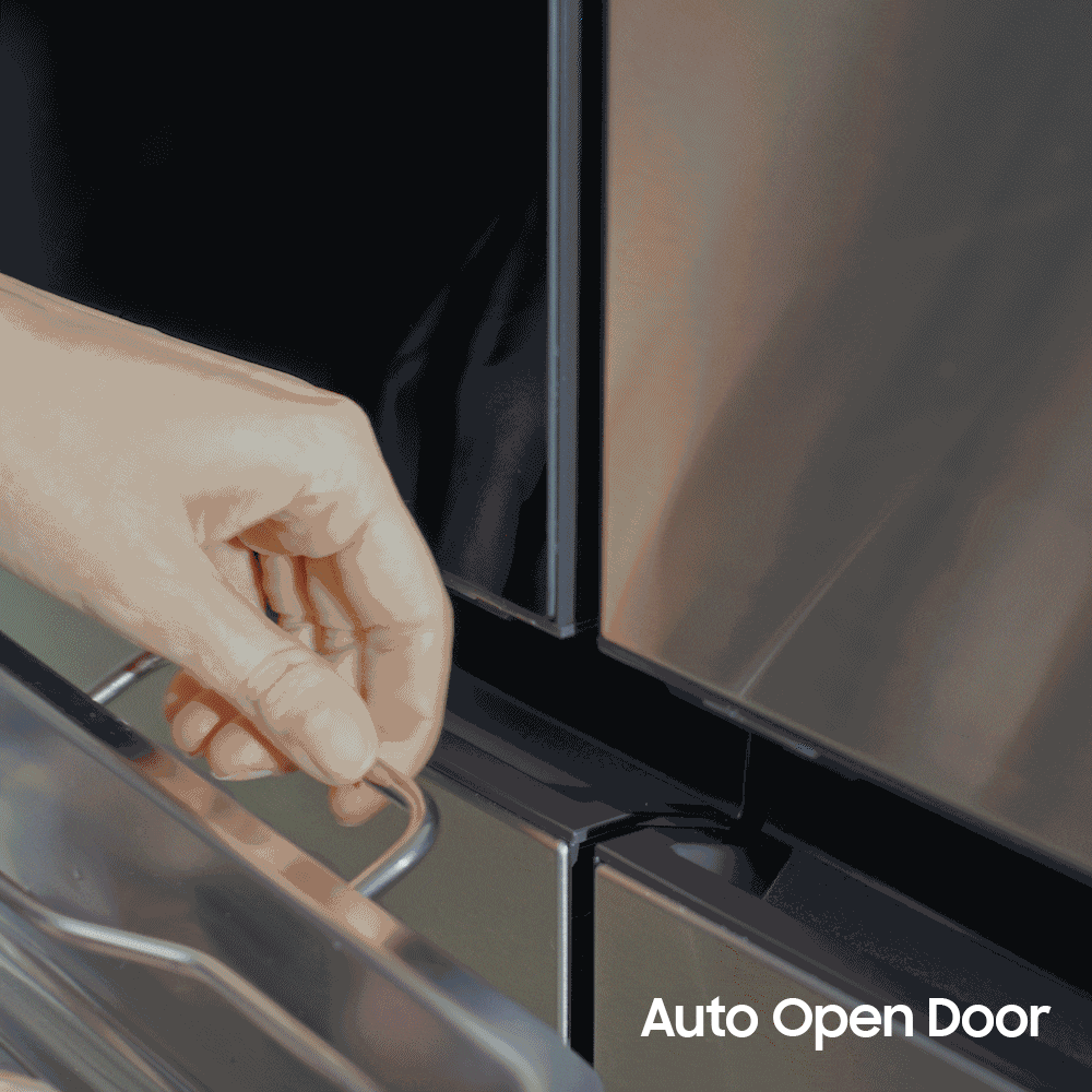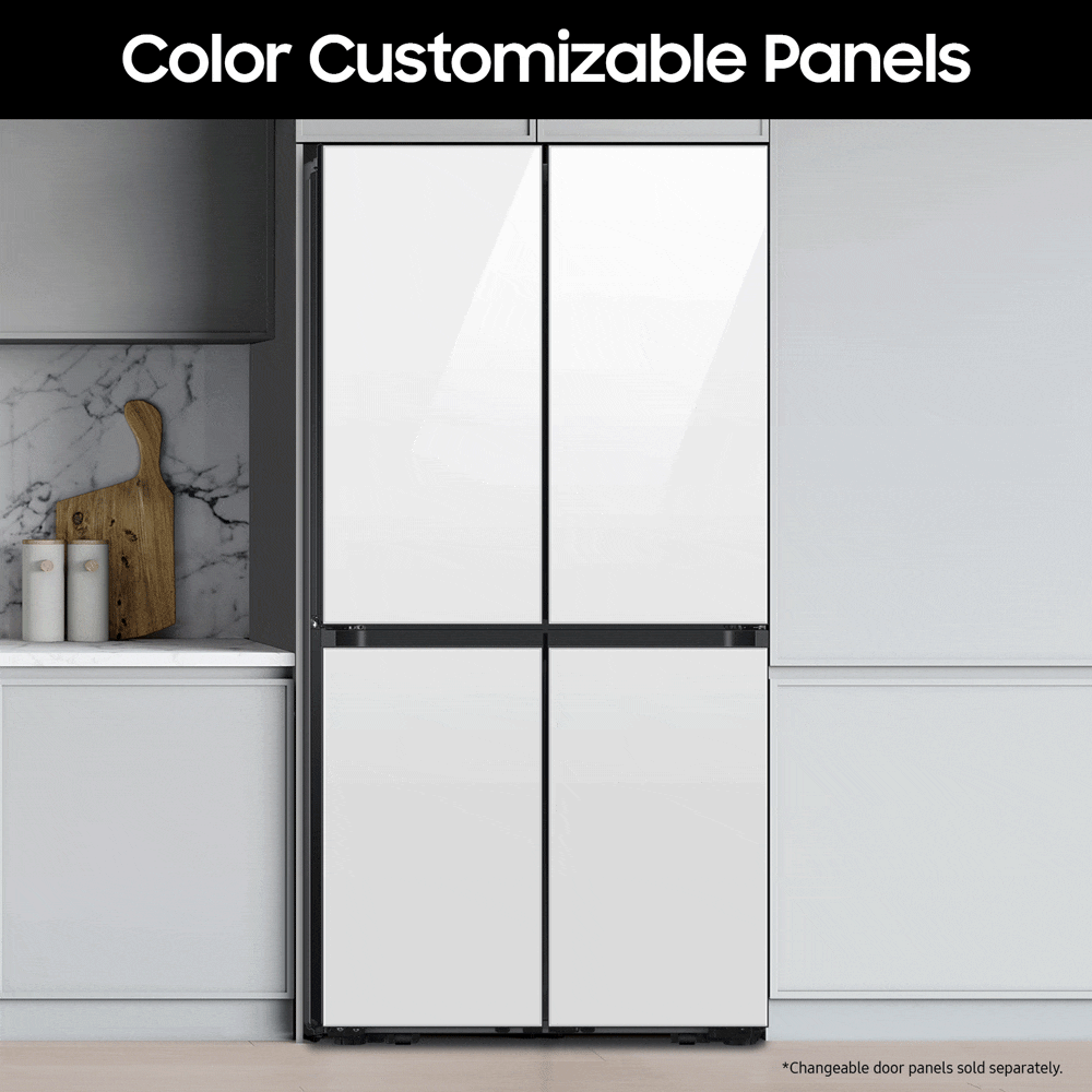Samsung’s Bespoke 4-Door Flex 29 cu-ft Refrigerator features AI Family Hub+ with the industry’s largest screen (Refrigerator smart video screen) and changeable door panels; (Changeable door panels are sold separately) AI Vision Inside (As of March 2024, AI Vision Inside can recognize 33 food items like fresh fruits and veggies; Recognizable food items will be regularly added and updated; If the food is covered by hand and not recognizable, it may be listed as an unknown item, but the user can always revise the item title through the Family Hub or SmartThings) automatically recognizes what’s in your fridge, so you always know what’s inside; Beverage Center provides quick and easy access to refreshingly cold water two ways; Open the refrigerator with ease, even if your hands are full with Auto Open Door; With just a light touch of the door sensor, the refrigerator door will open (An automatic closing function is not available; the actual open angle of the doors can be different by the installation circumstances and usage conditions like storing heavy items in the door bins; touch sensors can be turned on/off from the control panel/display, and its default setting is off).