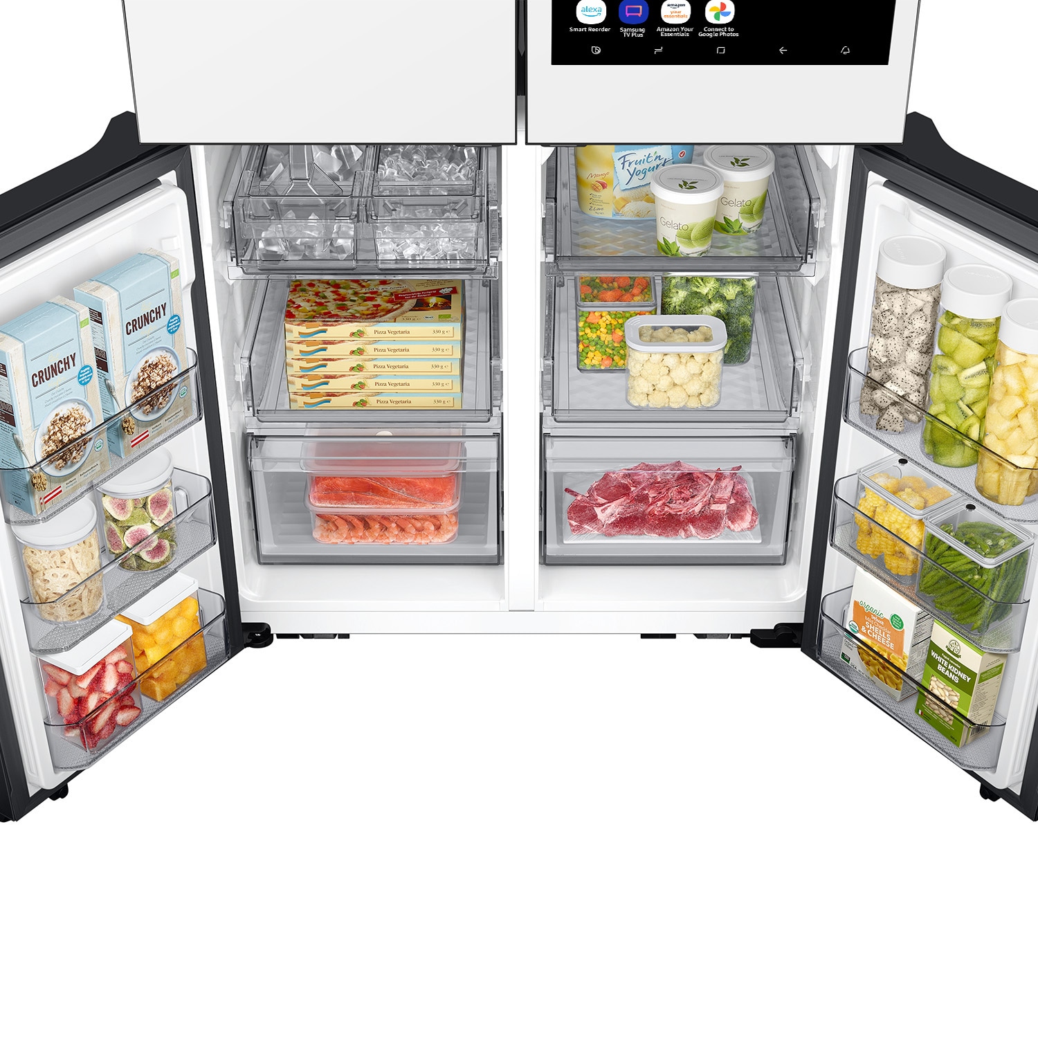 Meal plan like a pro: See what’s inside your fridge from your phone, or just swipe or tap the screen; AI Vision Inside(As of March 2024, AI Vision Inside can recognize 33 food items like fresh fruits and veggies; Recognizable food items will be regularly added and updated; If the food is covered by hand and not recognizable, it may be listed as an unknown item, but the user can always revise the item title through the Family Hub or SmartThings) keeps track of what food goes in and out of your fridge and recommends recipes based on what you have on hand; SmartThings Food helps you meal plan, add items to your Shopping List, find ‘community’ recipes from other users and preheat your oven( SmartThings App available on Android and iOS devices; A Wi Fi connection and Samsung account required)
