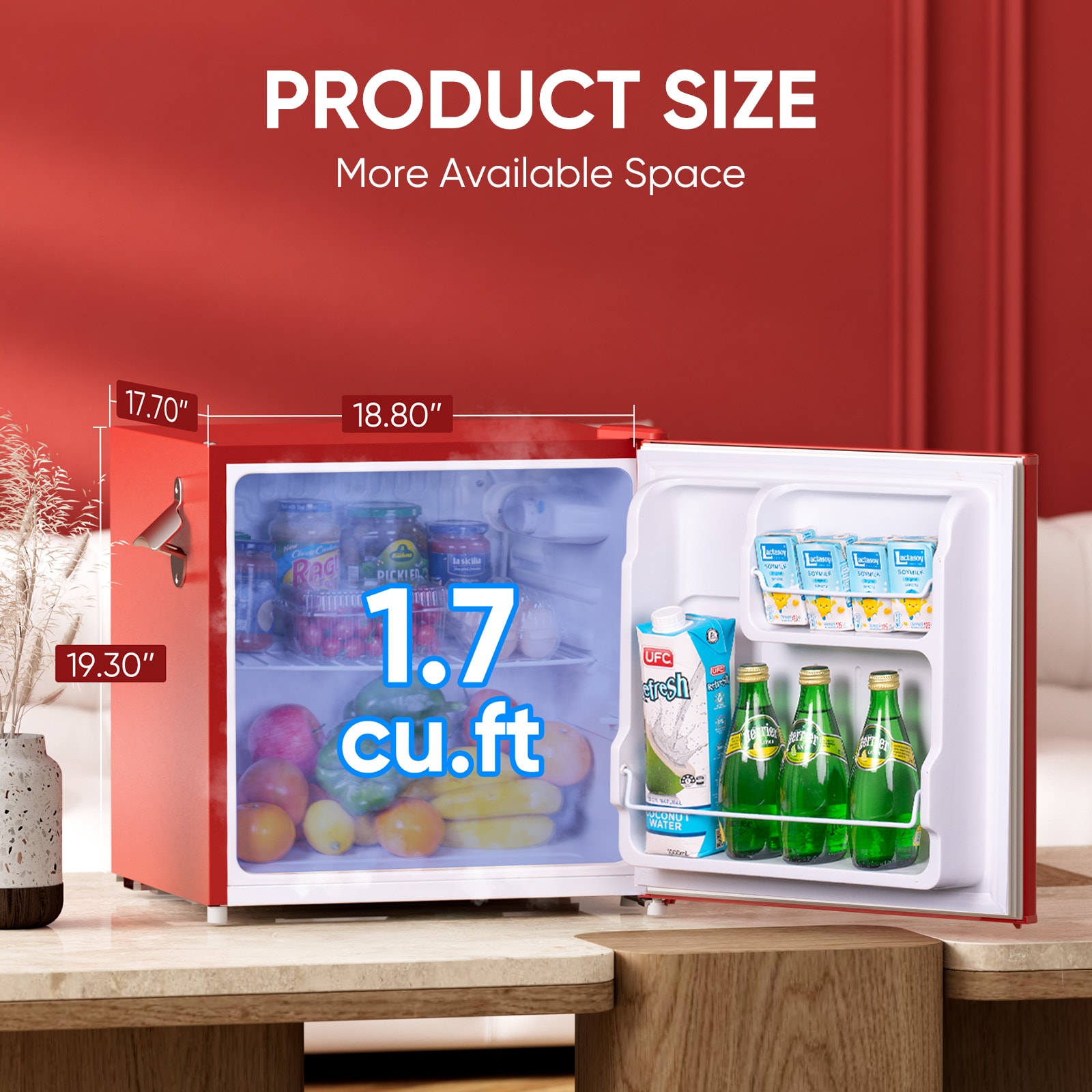 Featuring a classic exterior with metal handle and side bottle opener, the overall appearance of this retro refrigerator is stylish and high texture.