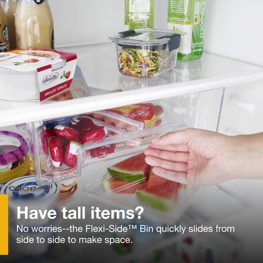 Do you like your freezer at eye level? This classic Whirlpool 20 cu top-freezer refrigerator is sized to fit the fresh foods, beverages, and frozen items your family loves. Purposeful storage features like a separate dairy bin and side bin that flexes to accommodate larger items simplify the task of figuring out where to put your groceries.