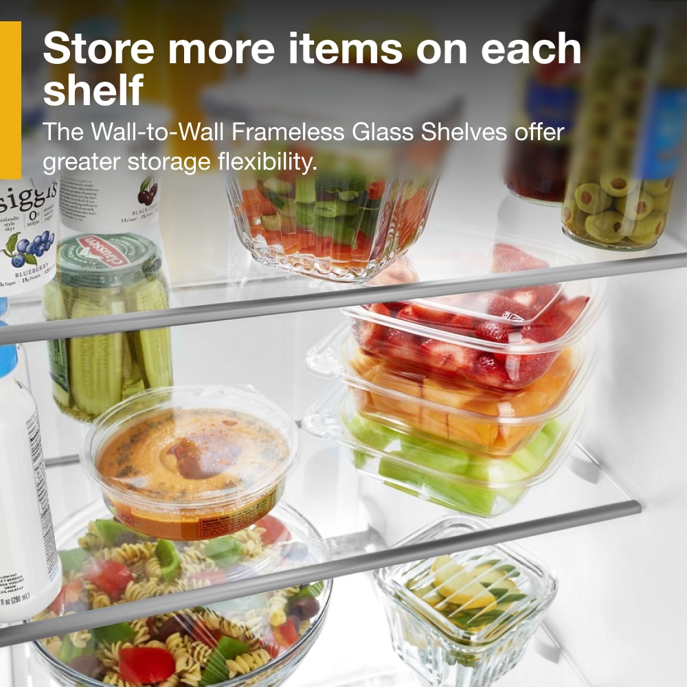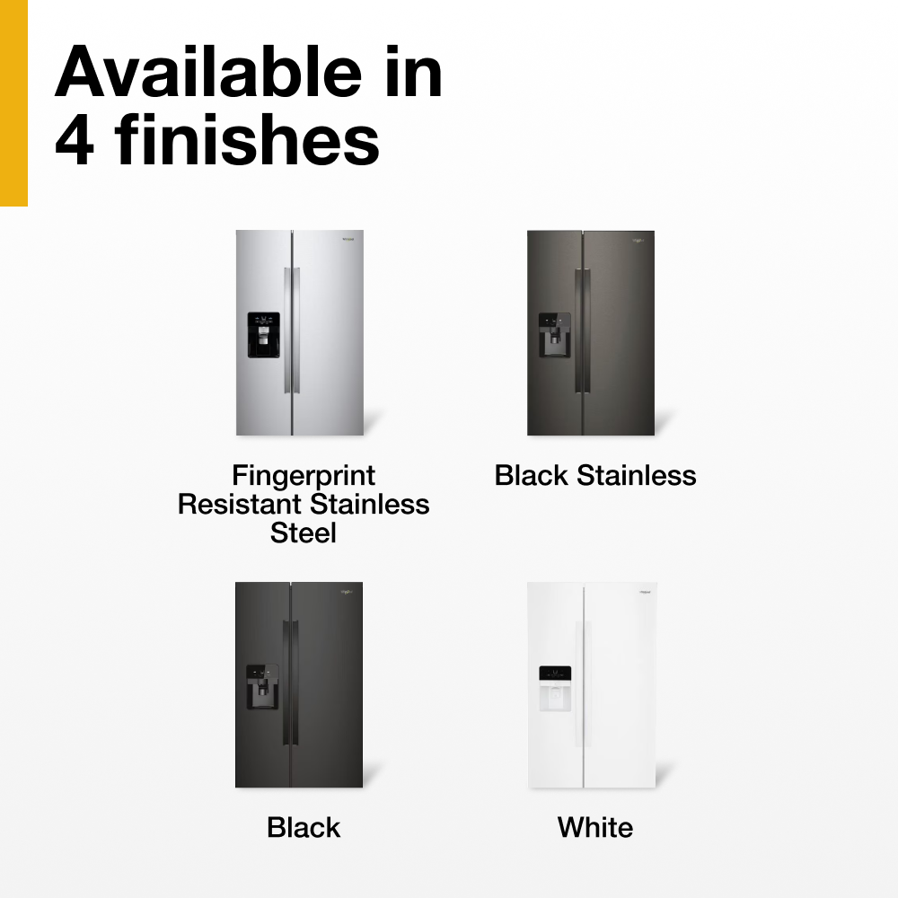 Enjoy purposefully designed storage spaces for the items your family uses the most. This Whirlpool® 25 cu. ft. Side-By-Side Refrigerator is designed with features to help you fit and find your favorite foods, like an in-door Can Caddy, Frameless Glass Shelves that offer greater storage flexibility and a Deli Drawer. This model also allows access to fresh filtered water and ice without ever opening the refrigerator door. Whirlpool® Side-by-Side Refrigerators have the lowest repair rate among side-by-side refrigerators. (*Claim compares Whirlpool branded refrigerators to GE, Frigidaire, Samsung and LG.Based on service required data, Q2 2022-Q2 2023, Traqline – The Stevenson Company, 2023.)