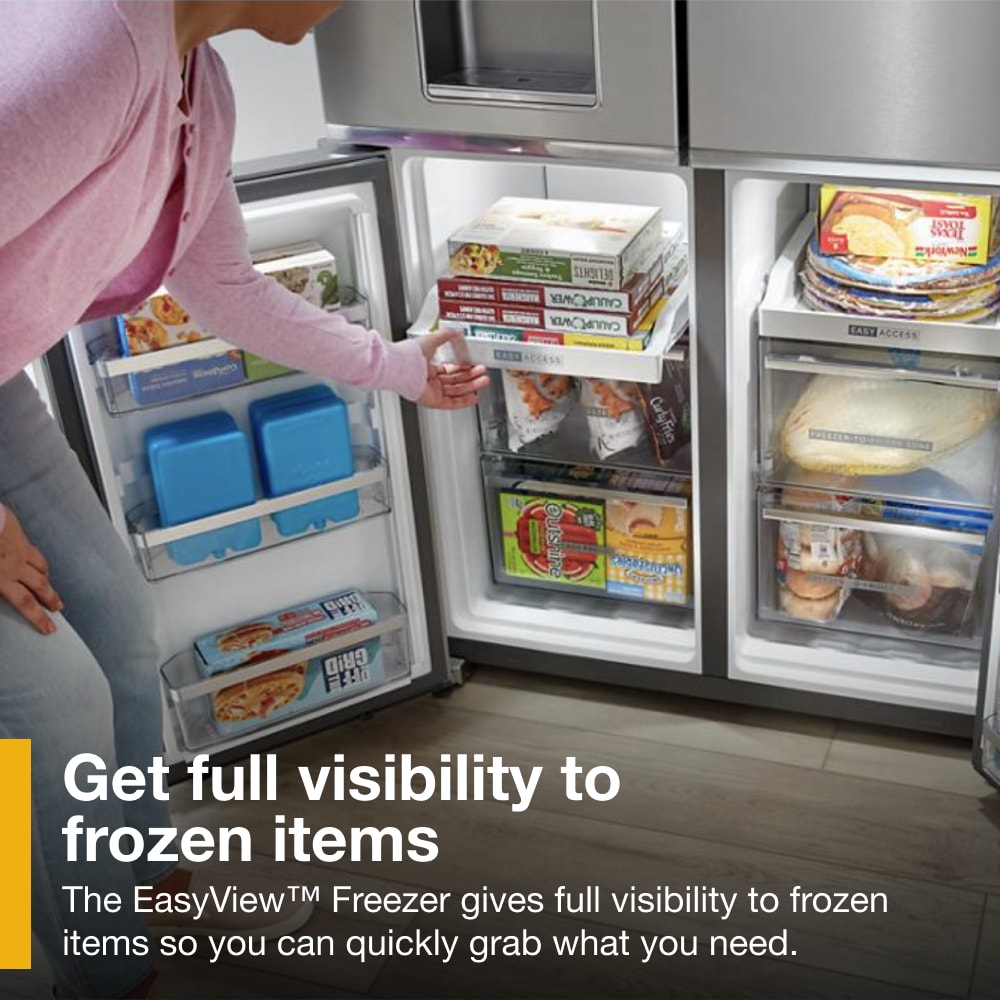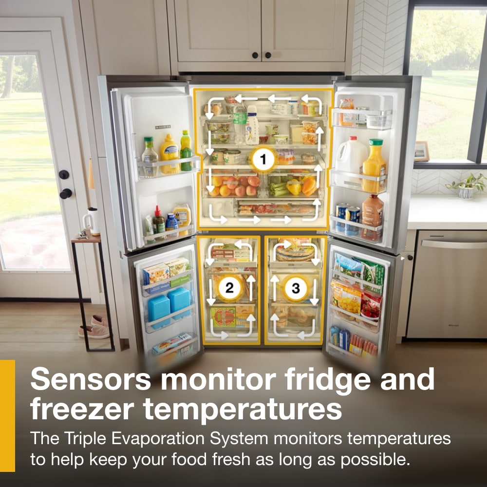 Discover Whirlpool brand’s most flexible refrigerator. This 4-Door Counter Depth Refrigerator cuts down on clutter by giving you more ways to organize, so you can say goodbye to lost or forgotten food. Freezer-to-Fridge Zone allows you to choose between more freezer or fridge capacity when you need it. This model also offers access to freshly filtered water and ice without having to open the freezer door, and a Triple Evaporation System with three different sensors that monitor refrigerator and freezer temperatures.